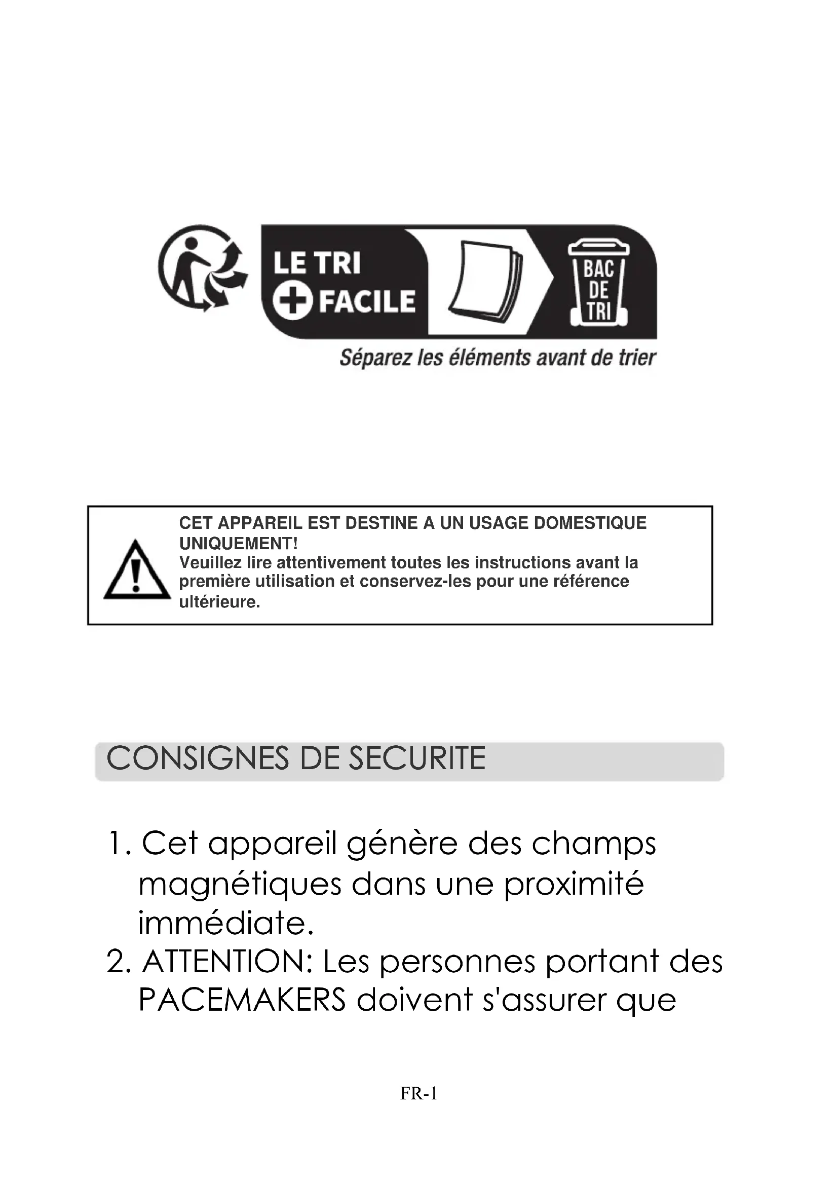 PACEMAKERS doivent s'assurer que CET APPAREIL EST DESTINE A UN USAGE DOMESTIQUE UNIQUEMENT! Veuillez lire attentivement toutes les instructions avant la première utilisation et conservez-les pour une référence ultérieure. FR-1leurs pacemakers aient été conçus en conformité avec les standards en vigueur. Il est recommandé de consulter le fabricant ou votre médecin afin de s'assurer qu'il n'y ait pas d'incompatibilité.