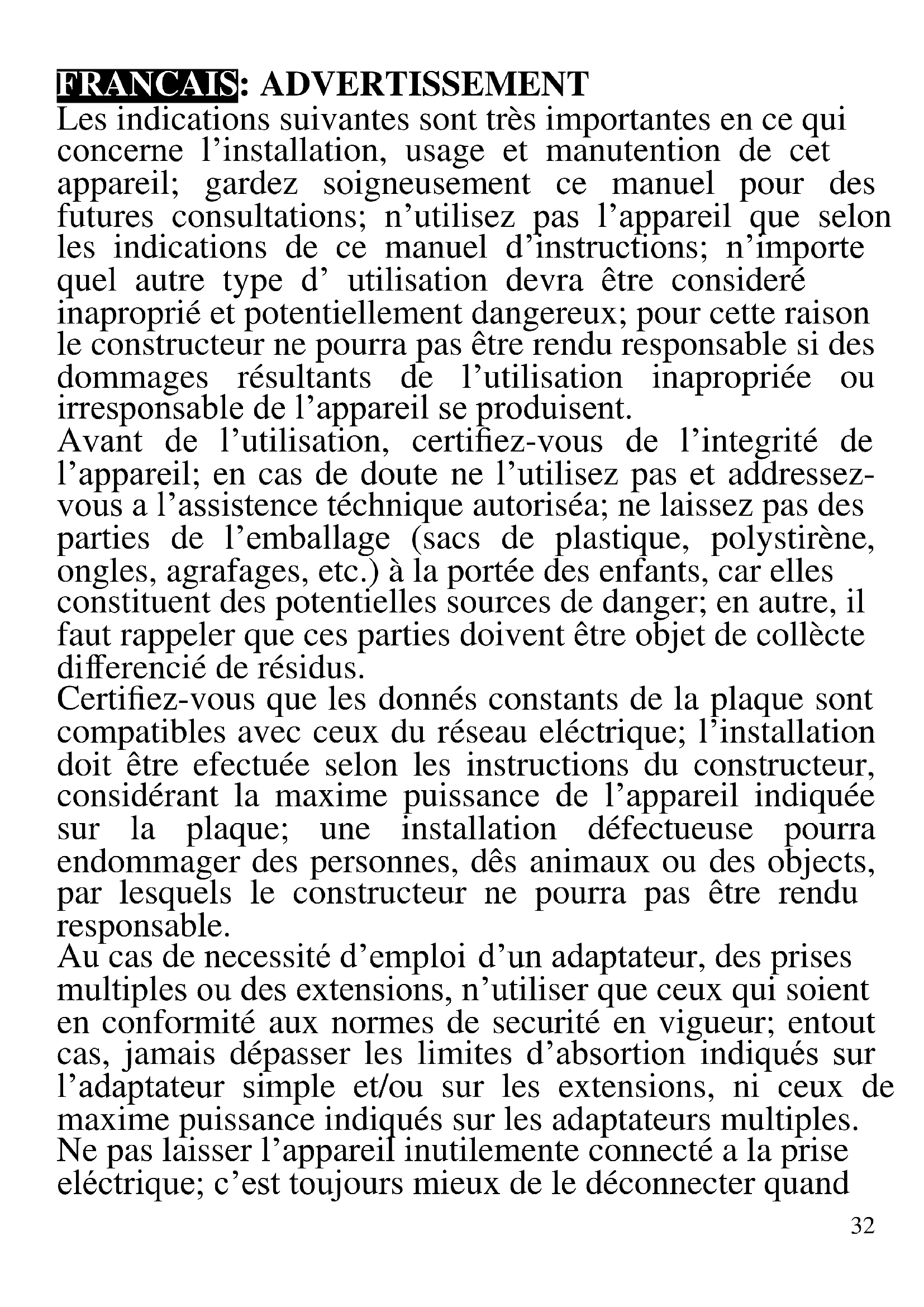 Das Symbol auf der rechten Seite zeigt, dass das Gerät den Anforderungen der neuen Richtlinien entspricht, die eingeführt wurden, um die Umwelt zu schützen (2002/96/EG, 2003/108/EG, 2002/95/EG, 2012/19/EG), und ordnungsgemäß am Ende seiner Lebensdauer entsorgt werden muss. Erkundigen Sie sich an Ihrem Wohnort, wo sich entsprechende Deponien für die Entsorgung von Elektroschrott befinden. Wenn Sie das Gerät nicht gemäß den in diesem Absatz genannten Vorschriften entsorgen, haften Sie nach den gesetzlichen Bestimmungen.32 FRANCAIS: ADVERTISSEMENT Les indications suivantes sont très importantes en ce qui concerne l’installation, usage et manutention de cet appareil; gardez soigneusement ce manuel pour des futures consultations; n’utilisez pas l’appareil que selon les indications de ce manuel d’instructions; n’importe quel autre type d’ utilisation devra être consideré inaproprié et potentiellement dangereux; pour cette raison le constructeur ne pourra pas être rendu responsable si des dommages résultants de l’utilisation inapropriée ou irresponsable de l’appareil se produisent. Avant de l’utilisation, certifiez-vous de l’integrité de l’appareil; en cas de doute ne l’utilisez pas et addressez- vous a l’assistence téchnique autoriséa; ne laissez pas des parties de l’emballage (sacs de plastique, polystirène, ongles, agrafages, etc.) à la portée des enfants, car elles constituent des potentielles sources de danger; en autre, il faut rappeler que ces parties doivent être objet de collècte differencié de résidus. Certifiez-vous que les donnés constants de la plaque sont compatibles avec ceux du réseau eléctrique; l’installation doit être efectuée selon les instructions du constructeur, considérant la maxime puissance de l’appareil indiquée sur la plaque; une installation défectueuse pourra endommager des personnes, dês animaux ou des objects, par lesquels le constructeur ne pourra pas être rendu responsable. Au cas de necessité d’emploi d’un adaptateur, des prises multiples ou des extensions, n’utiliser que ceux qui soient en conformité aux normes de securité en vigueur; entout cas, jamais dépasser les limites d’absortion indiqués sur l’adaptateur simple et/ou sur les extensions, ni ceux de maxime puissance indiqués sur les adaptateurs multiples. Ne pas laisser l’appareil inutilemente connecté a la prise eléctrique; c’est toujours mieux de le déconnecter quand33 il n’est pas à l’use. Débranchez toujours l'appareil de l'alimentation électrique s'il est laissé sans surveillance et avant de l'assembler et de le désassembler. Pour le nettoyage déconnectez la fiche du secteur électrique. Quand l’appareil soit hors usage et ait été décidé qu’il ne sera pas reparé, on reccomande son inutilisation, en coupant son câble d’alimentation. - Ne pas approcher le câble d’alimentation d’objects coupants ou de surfaces chaudes, et ne pas tirer sur le cordon d’alimentation pour le débrancher de la prise. Ne le laissez pas pendre du plan de travail où un enfant pourrait le tenir. - Ne pas utiliser l’appareil si le câble d’alimentation ou la fiche de connéction eléctrique sont endommagés, ou encore en cas de court-circuits; dans ce cas là, apporter l’appareil a un centre d’assistence autorisé. - L’appareil n’est pas indiqué pour être exposé à des conditions météorologiques défavorables (pluie, vent, humidité, la glace, etc.); Gardez-le dans un endroit sec. Jamais opérer ou même toucher l’appareil avec les mains mouillées ou les pieds nus. - Les enfants ne doivent pas jouer avec cet appareil. - Cet appareil peut être utilisé par des enfants agés de plus de 8 ans et par des personnes avec une réduite capacité phisique, sensorial ou mental, ou encore avec peu d’expérience à son usage, pourvu qu’une supervision adéquate leur en soit assuré, ou s’ils auraient été instruits à l’usage de l’appareil en complete securité. Les opérations de nettoyage e de manutention ne oivent pás être efectués par des enfants, sauf pour ceux qui sont agés de plus de 8 ans et sont supervisionés. - Gardez l’appareil et le câble d’alimentation hors la portée des enfants agés de moins de 8 ans. - L’appareil est pour l’usage domestique et intérieur.34 Au cas de panne et/ou de mauvais fonctionnement, ne pas intervenir sur l’ appareil. Pour une éventuel réparation s’addresser uniquement a un centre autorisé par le constructeur, en demandant dês pièces de remplacement originaux. Le non respect de ces indications peut compromettre la securité de l’appareil e rendre invalides les termes de la garantie. ATTENTION: Cet appareil comporte une fonction de chauffage. Quelques surfaces, même si non la plaque elle même, pourront atteindre des températures élevées. Étant donné que la sensibilité à la température diffère de personne à personne, cet appareil devrà être usé avec PRUDENCE. Placez l’appareil sur des surfaces adéhrentes et préparées pour cet effet, et utilisez les mésures de protection contre la chaleur conseillées, comme dês poignées ou des gants de cuisine. - Cet appareil est destiné à être utilisé dans les ménages et des applications similaires: les cuisines du personnel dans les magasins, bureaux et autres environnements de travail, pour les clients dans les hôtels, motels et autres environnements de type résidentiel, de type lit et petit- déjeuner, hébergement. - N’utiliser que des accéssoires e pièces d’origine. - Avant chaque utilisation, effectuez le cordon d'alimentation. Ne soumettez pas le produit à des chocs susceptibles de l'endommager. - L’appareil n’est pas conçu pour être utilisé avec une minuterie extérieure ou un commande à distance. Avant chaque utilisation, effectuez le cordon d'alimentation. Ne soumettez pas le produit à des chocs susceptibles de l'endommager. - Tenir l’app