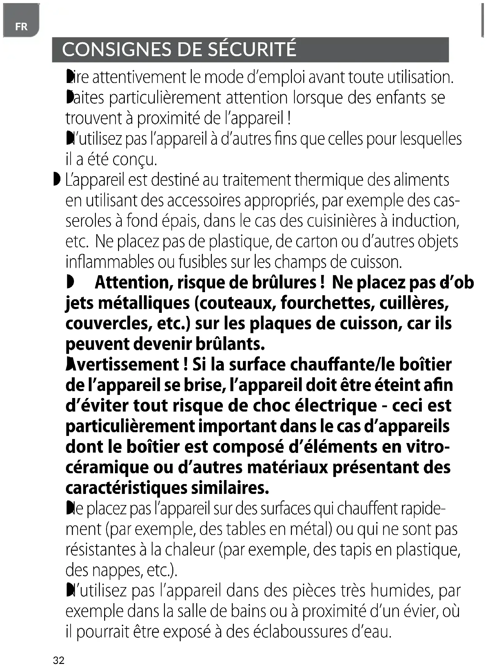 Avertissement ! Si la surface chauffante/le boîtier de l’appareil se brise, l’appareil doit être éteint afin d’éviter tout risque de choc électrique - ceci est particulièrement important dans le cas d’appareils dont le boîtier est composé d’éléments en vitro- céramique ou d’autres matériaux présentant des caractéristiques similaires.