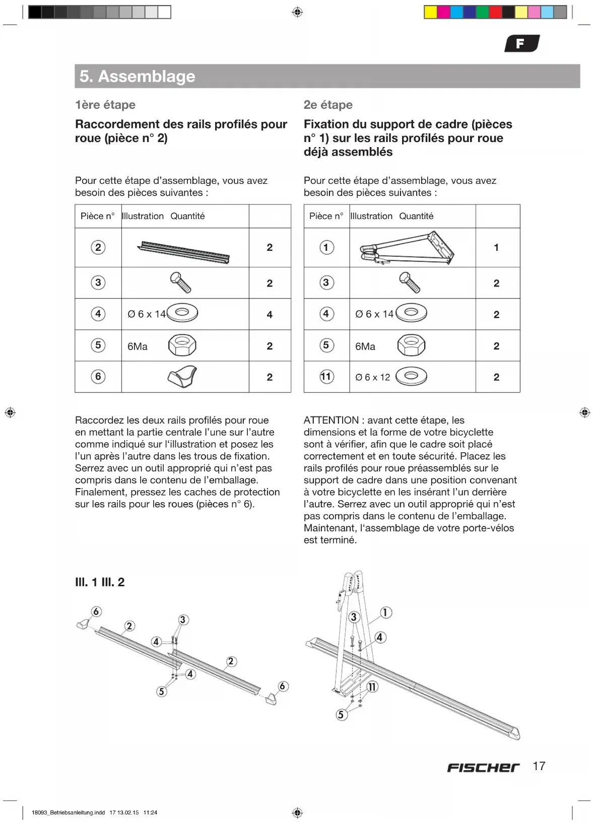 Cher client, chère cliente, Merci beaucoup d’avoir choisi le porte-vélo de toit FISCHER. Avec ce porte-vélos de toit, vous pouvez facilement et en tout sécurité transporter une bicyclette avec votre voiture. Ce porte-vélos de toit est livré en kit de montage. Avant la première utilisation, vous devez assembler soigneusement le porte-vélos de toit en vous reportant à ce mode d’emploi. Avertissement