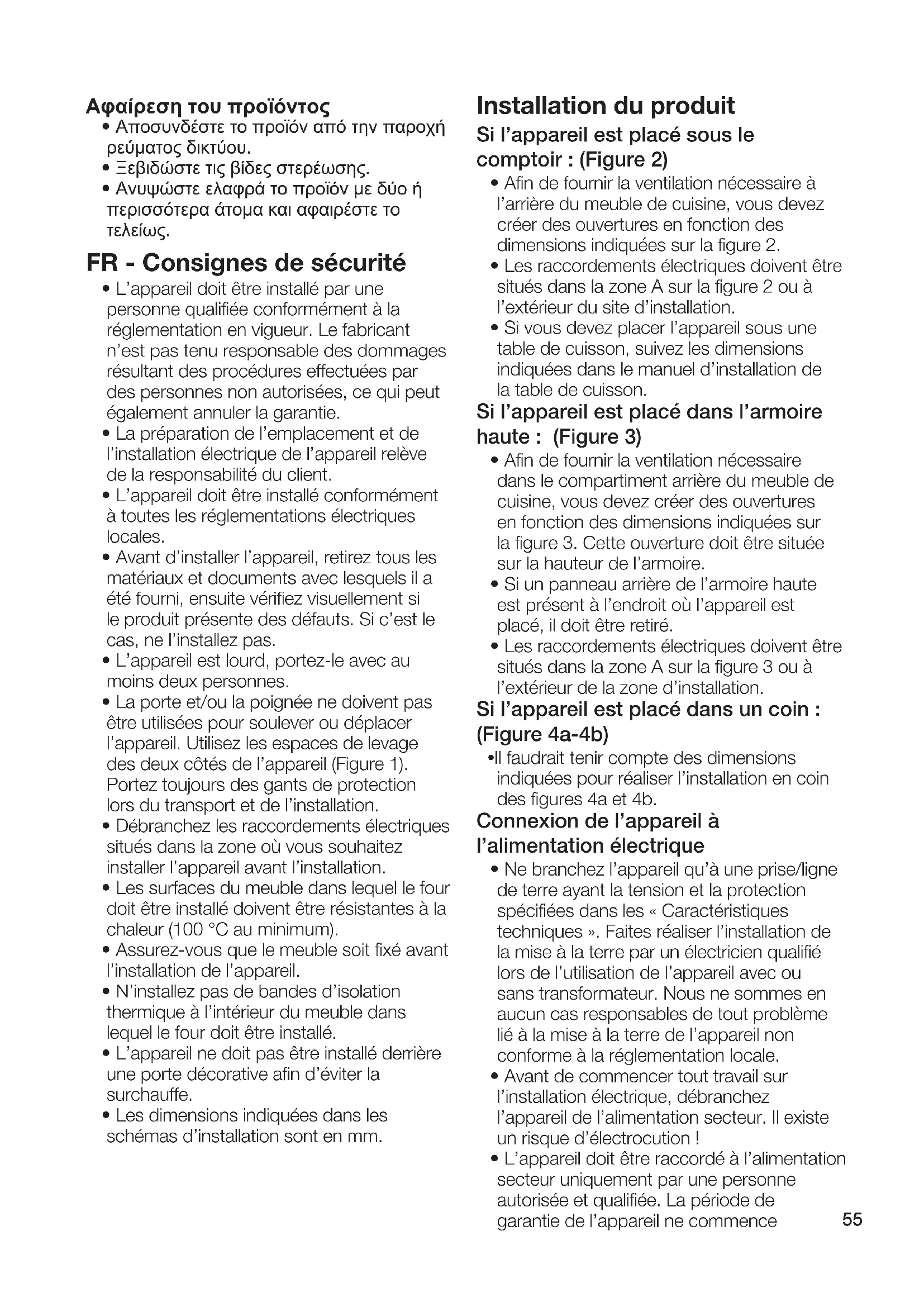 - Il faudrait tenir compte des dimensions indiquées pour réaliser l’installation en coin des figures 4a et 4b. Connexion de l’appareil à l’alimentation électrique