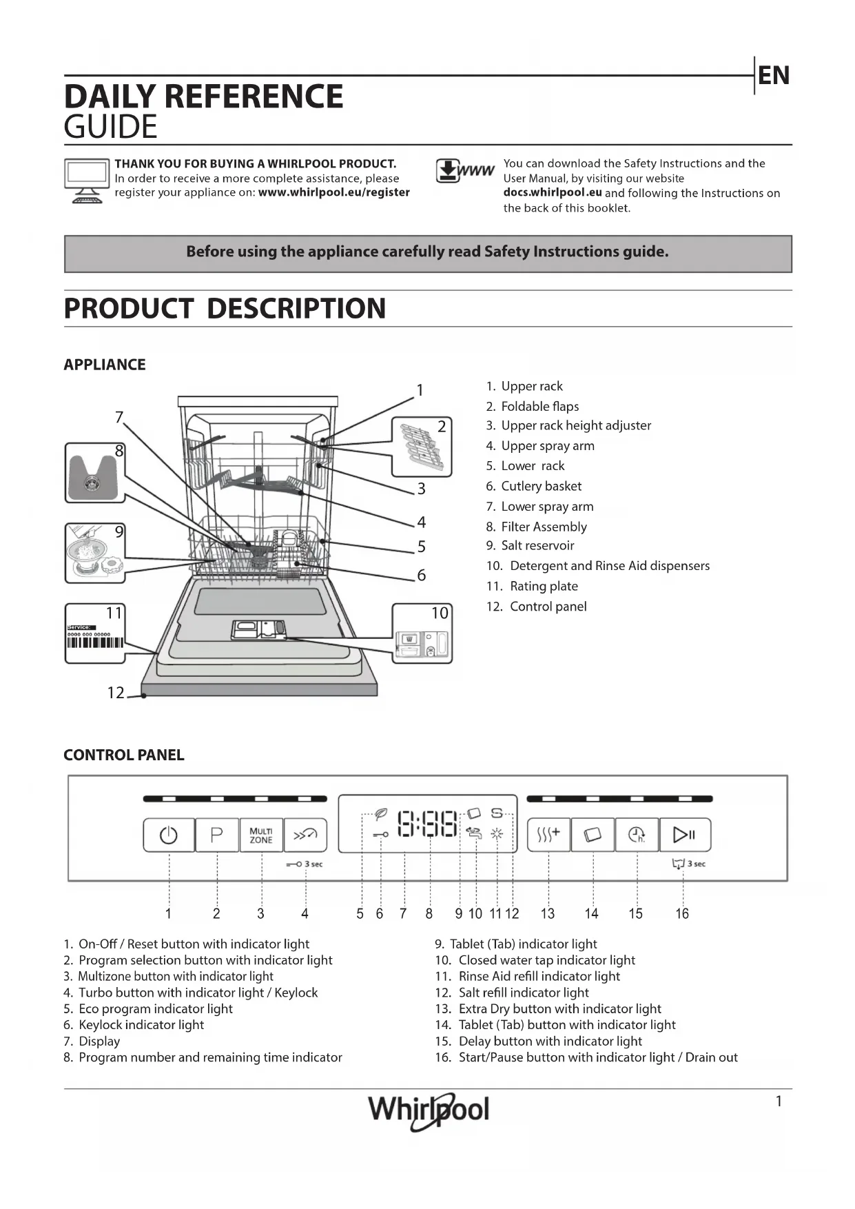 APPAREILMERCI D’AVOIR CHOISI UN PRODUIT WHIRLPOOL Afin de recevoir une assistance plus complète, merci d’enregistrer votre appareil sur on: www.whirlpool.eu/registerVous pouvez télécharger les Consignes de sécurité et le Manuel de l’utilisateur, en visitant notre site Internet docs.whirlpool.eu et en suivant les instructions figurant au verso du présent fascicule.PANNEAU DE COMMANDE