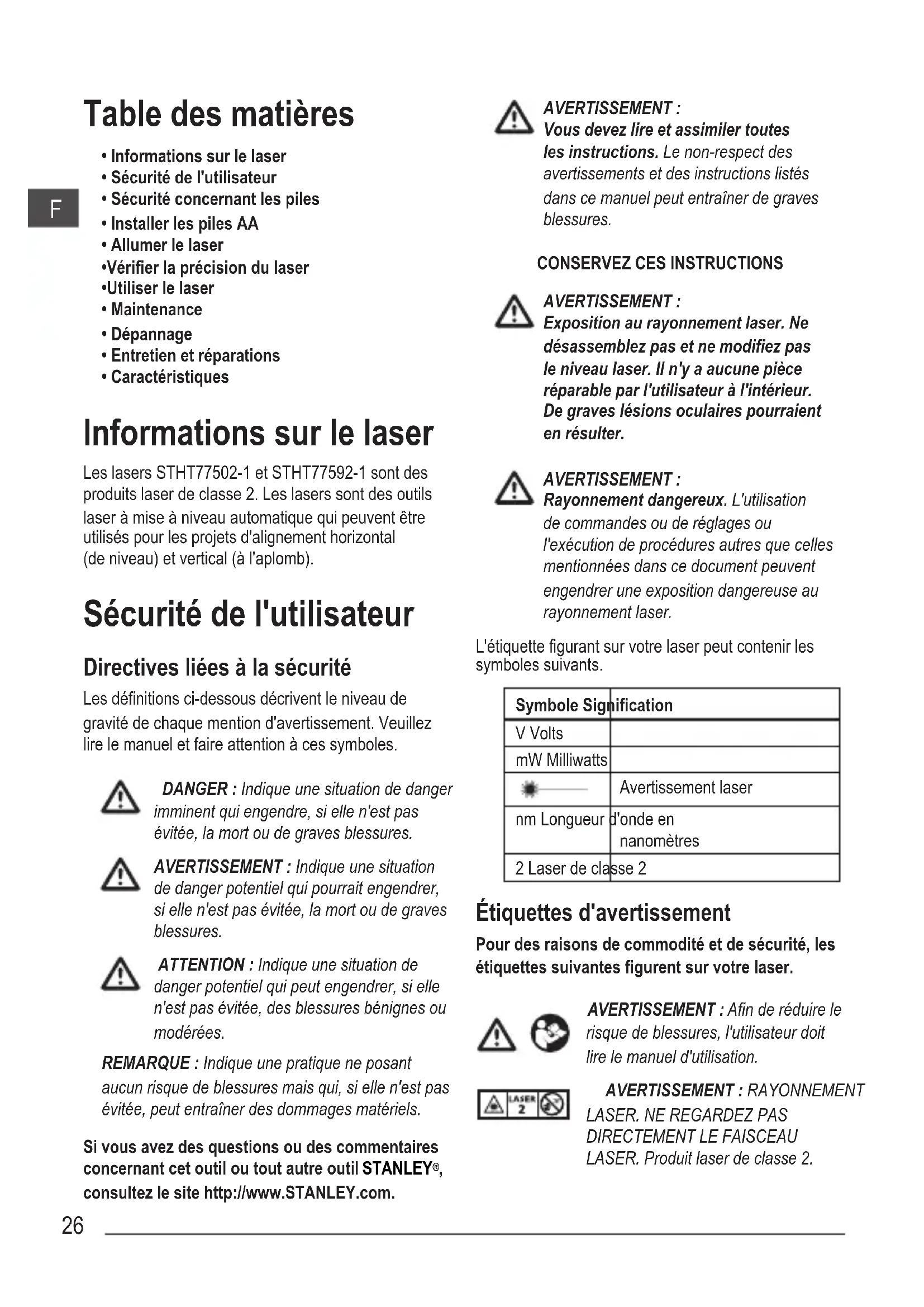 - Caractéristiques Informations sur le laser Les lasers STHT77502-1 et STHT77592-1 sont des produits laser de classe 2. Les lasers sont des outils laser à mise à niveau automatique qui peuvent être utilisés pour les projets d'alignement horizontal (de niveau) et vertical (à l'aplomb). Sécurité de l'utilisateur Directives liées à la sécurité Les dénitions ci-dessous décrivent le niveau de gravité de chaque mention d'avertissement. Veuillez lire le manuel et faire attention à ces symboles.