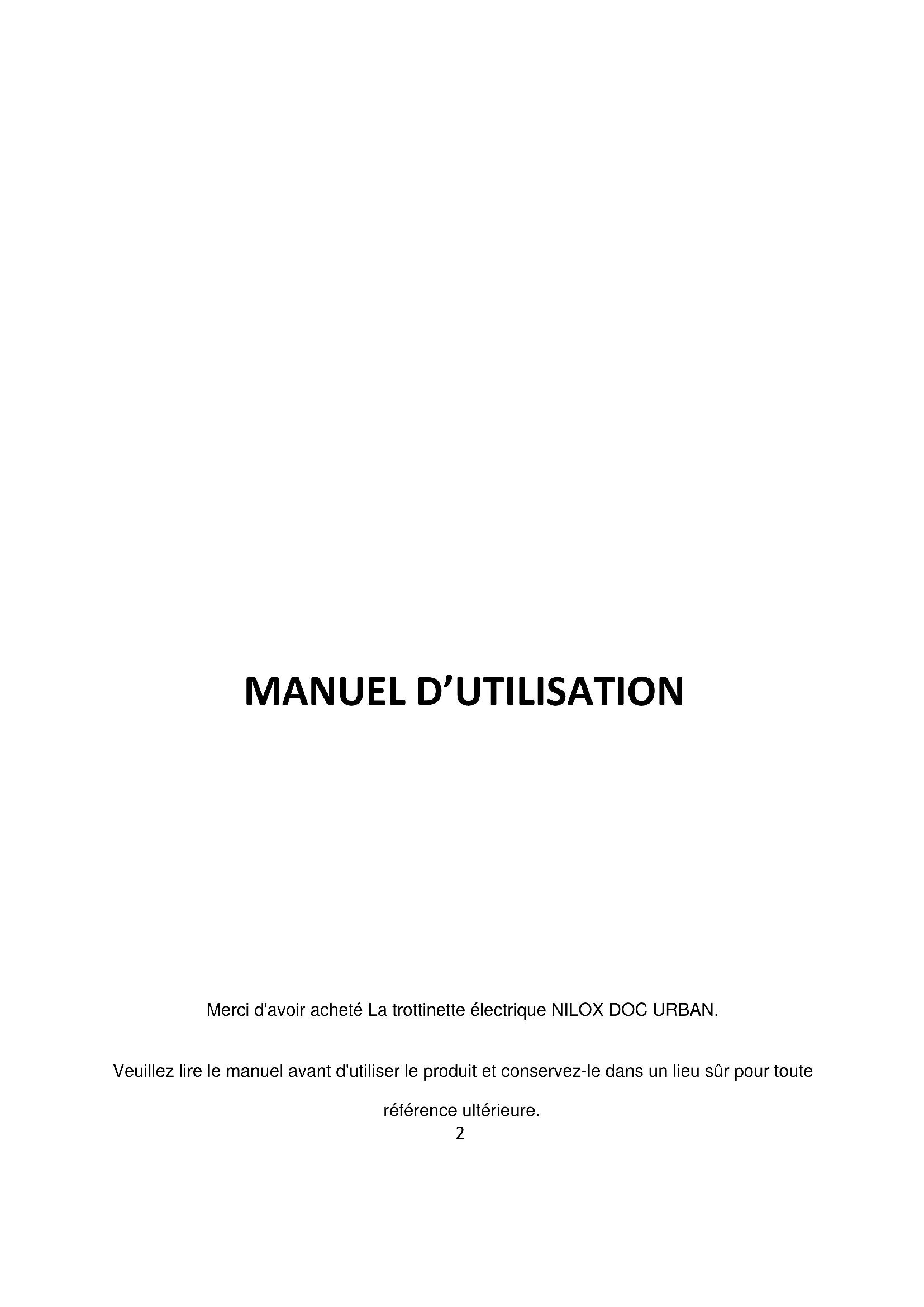 Merci d'avoir acheté La trottinette électrique NILOX DOC URBAN. Veuillez lire le manuel avant d'utiliser le produit et conservez-le dans un lieu sûr pour toute référence ultérieure.