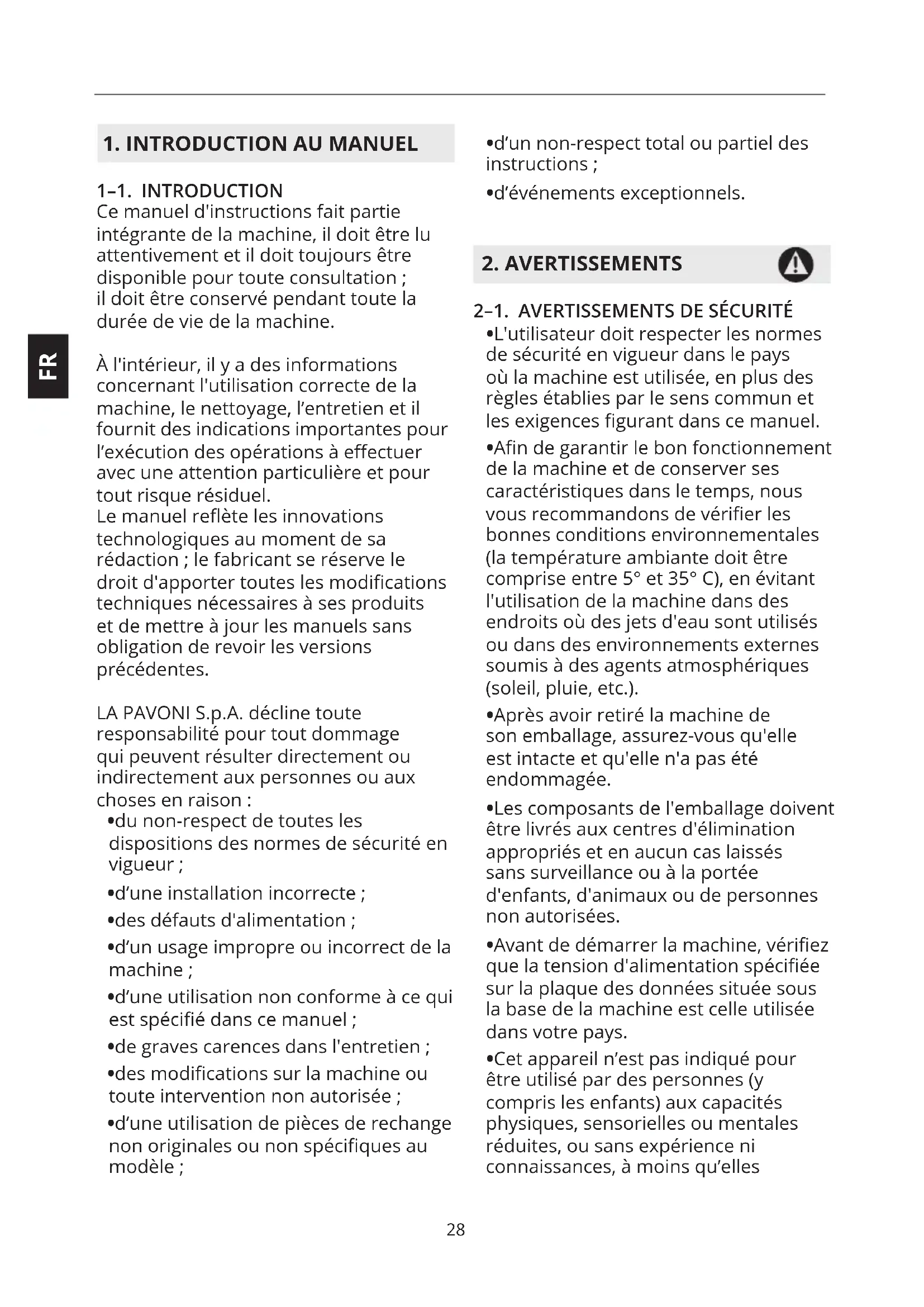 1–1. INTRODUCTION Ce manuel d'instructions fait partie intégrante de la machine, il doit être lu attentivement et il doit toujours être disponible pour toute consultation ; il doit être conservé pendant toute la durée de vie de la machine. À l'intérieur, il y a des informations concernant l'utilisation correcte de la machine, le nettoyage, l’entretien et il fournit des indications importantes pour l’exécution des opérations à eectuer avec une attention particulière et pour tout risque résiduel. Le manuel reète les innovations technologiques au moment de sa rédaction ; le fabricant se réserve le droit d'apporter toutes les modications techniques nécessaires à ses produits et de mettre à jour les manuels sans obligation de revoir les versions précédentes. LA PAVONI S.p.A. décline toute responsabilité pour tout dommage qui peuvent résulter directement ou indirectement aux personnes ou aux choses en raison :