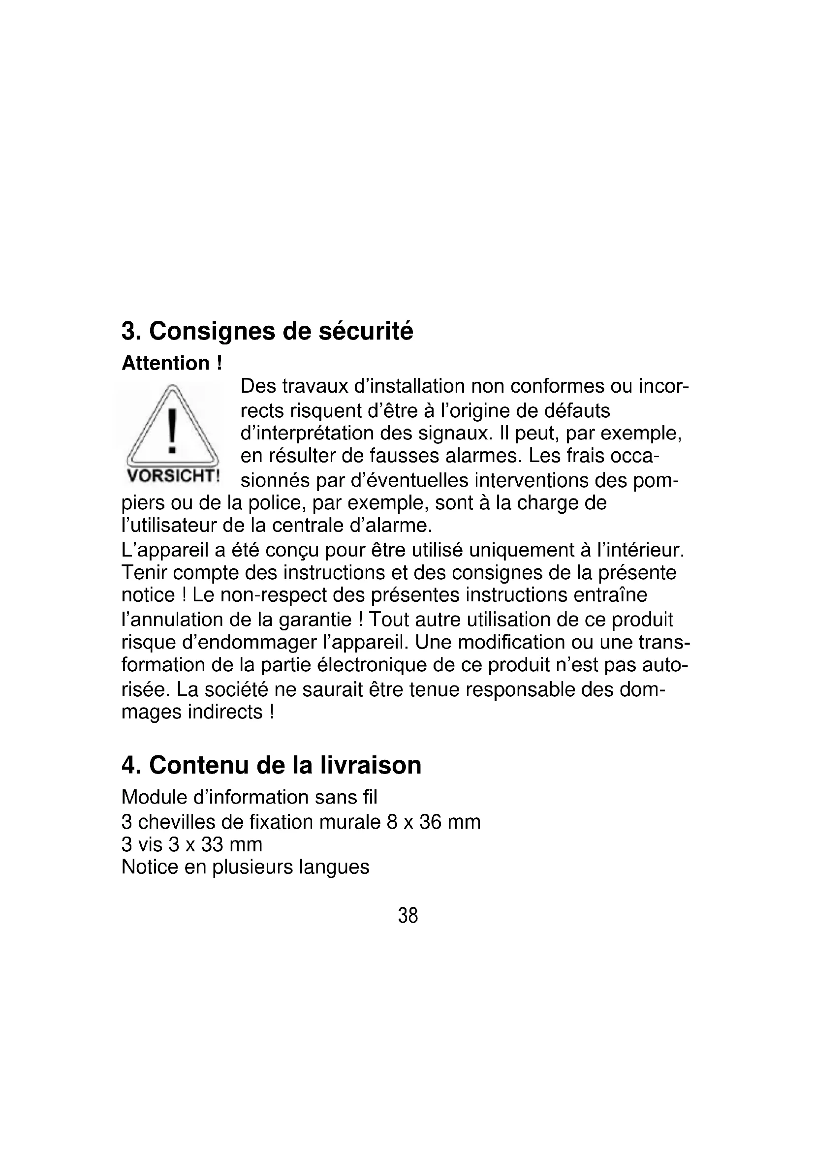 Attention ! Des travaux d’installation non conformes ou incor- rects risquent d’être à l’origine de défauts d’interprétation des signaux. Il peut, par exemple, en résulter de fausses alarmes. Les frais occa- sionnés par d’éventuelles interventions des pom- piers ou de la police, par exemple, sont à la charge de l’utilisateur de la centrale d’alarme. L’appareil a été conçu pour être utilisé uniquement à l’intérieur. Tenir compte des instructions et des consignes de la présente notice ! Le non-respect des présentes instructions entraîne l’annulation de la garantie ! Tout autre utilisation de ce produit risque d’endommager l’appareil. Une modification ou une trans- formation de la partie électronique de ce produit n’est pas auto- risée. La société ne saurait être tenue responsable des dom- mages indirects !