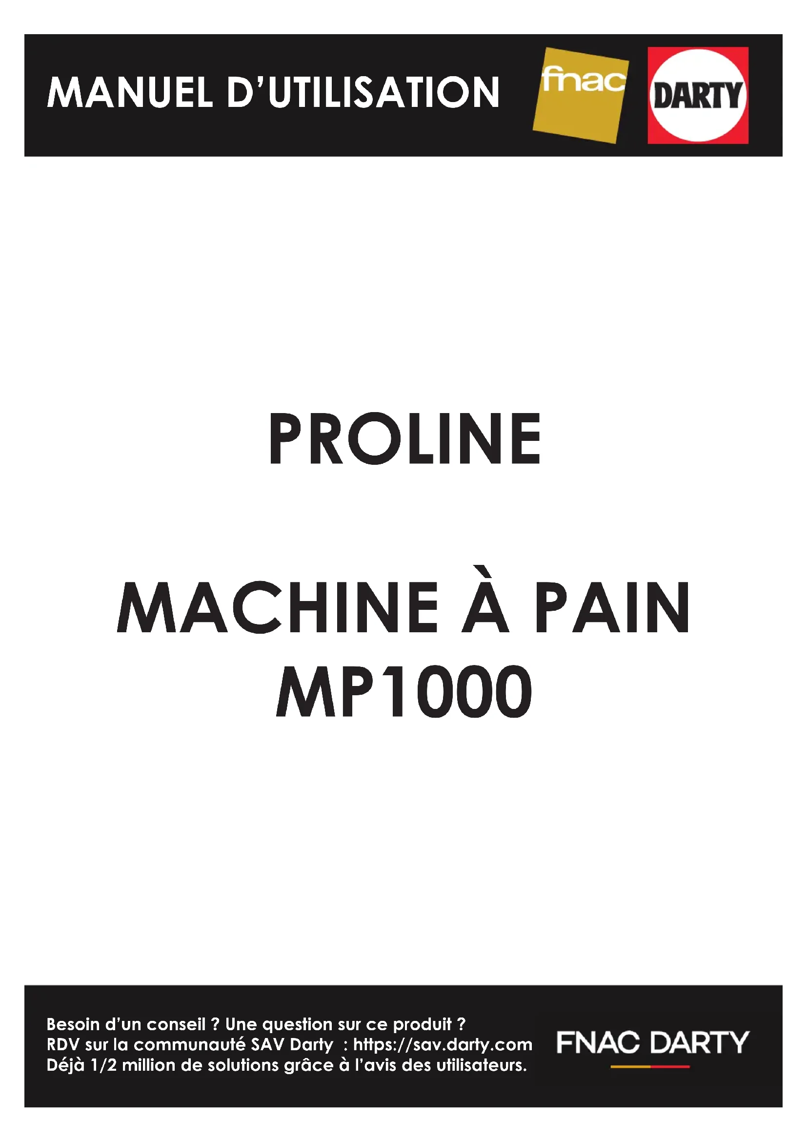 Besoin d’un conseil ? Une question sur ce produit ? RDV sur la communauté SAV Darty : https://sav.darty.com Déjà 1/2 million de solutions grâce à l’avis des utilisateurs. PROLINE MACHINE À PAIN MP1000