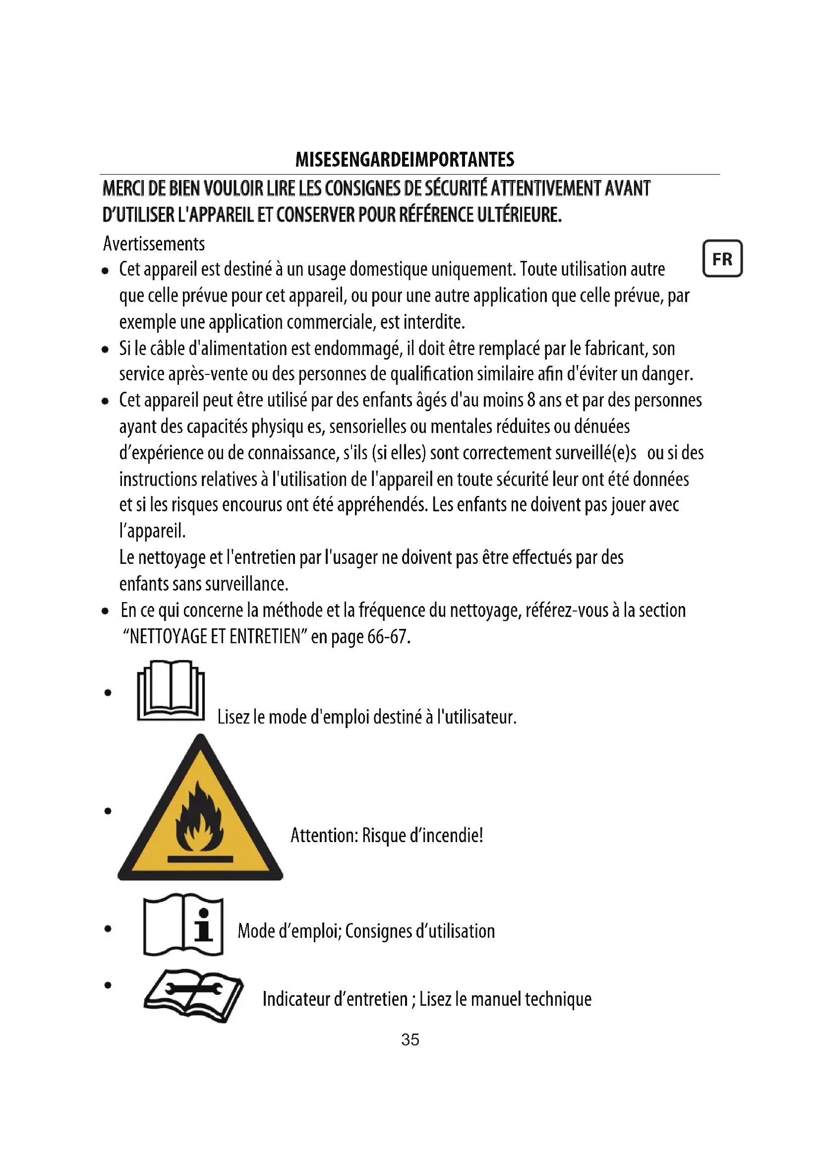 fants sans surveillance. En ce qui concerne la méthode et la fréquence du ne ttoyage, référez-vous à la section “NETTOYAGE ET ENTRETIEN” en page 66-67. Lisez le mode d'emploi destiné à l'utilisateur. Attention: Risque d’incendie! Mode d’emploi; Consignes d’utilisation Indicateur d’entretien ; Lisez le manuel technique