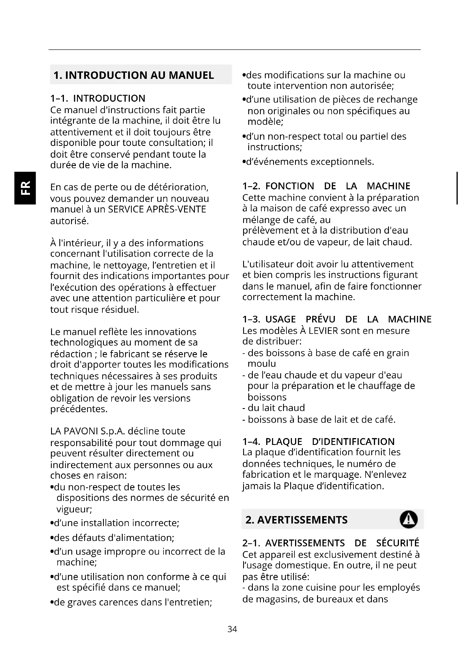 1–1. INTRODUCTION Ce manuel d'instructions fait partie intégrante de la machine, il doit être lu attentivement et il doit toujours être disponible pour toute consultation; il doit être conservé pendant toute la durée de vie de la machine. En cas de perte ou de détérioration, vous pouvez demander un nouveau manuel à un SERVICE APRÈS-VENTE autorisé. À l'intérieur, il y a des informations concernant l'utilisation correcte de la machine, le nettoyage, l’entretien et il fournit des indications importantes pour l’exécution des opérations à eectuer avec une attention particulière et pour tout risque résiduel. Le manuel reète les innovations technologiques au moment de sa rédaction ; le fabricant se réserve le droit d'apporter toutes les modications techniques nécessaires à ses produits et de mettre à jour les manuels sans obligation de revoir les versions précédentes. LA PAVONI S.p.A. décline toute responsabilité pour tout dommage qui peuvent résulter directement ou indirectement aux personnes ou aux choses en raison: