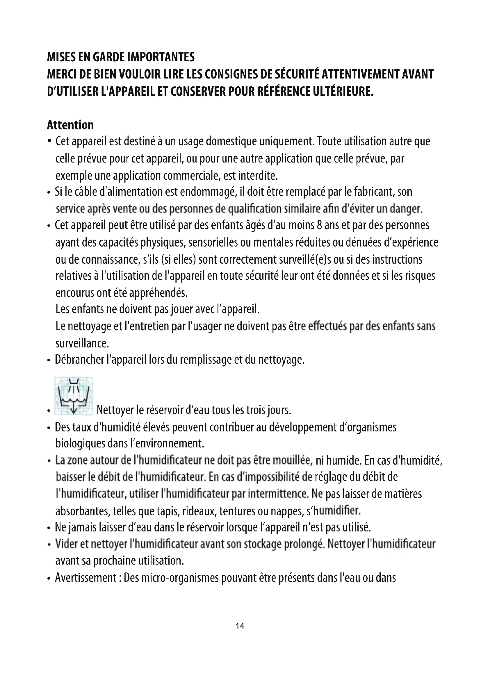 - Avertissement : Des micro-organismes pouvant être présents dans l'eau ou dans 14l'environnement dans lequel l‘appareil est utilisé ou stocké peuvent se développer dans le réservoir d‘eau et être projetés dans l‘air, entraînant des risques très graves pour la santé si l‘eau n‘est pas renouvelée et que le réservoir n'est pas nettoyé correctement tous les 3 jours.