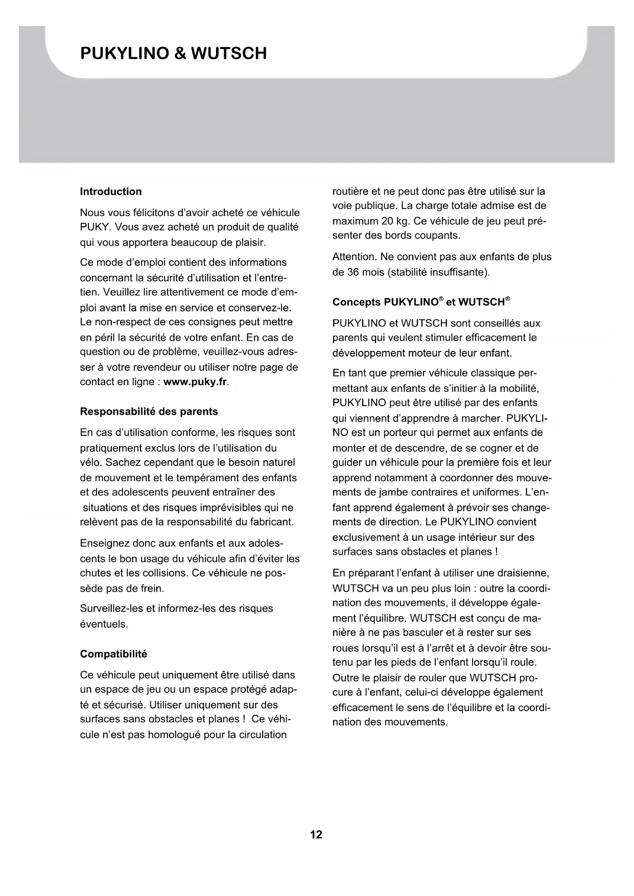 PUKYLINO et WUTSCH sont conseillés aux parents qui veulent stimuler efficacement le développement moteur de leur enfant. En tant que premier véhicule classique per- mettant aux enfants de s’initier à la mobilité, PUKYLINO peut être utilisé par des enfants qui viennent d’apprendre à marcher. PUKYLI- NO est un porteur qui permet aux enfants de monter et de descendre, de se cogner et de guider un véhicule pour la première fois et leur apprend notamment à coordonner des mouve- ments de jambe contraires et uniformes. L’en- fant apprend également à prévoir ses change- ments de direction. Le PUKYLINO convient exclusivement à un usage intérieur sur des surfaces sans obstacles et planes ! En préparant l’enfant à utiliser une draisienne, WUTSCH va un peu plus loin : outre la coordi- nation des mouvements, il développe égale- ment l’équilibre. WUTSCH est conçu de ma- nière à ne pas basculer et à rester sur ses roues lorsqu’il est à l’arrêt et à devoir être sou- tenu par les pieds de l’enfant lorsqu’il roule. Outre le plaisir de rouler que WUTSCH pro- cure à l’enfant, celui-ci développe également efficacement le sens de l’équilibre et la coordi- nation des mouvements.13 PUKYLINO & WUTSCH Mode d’emploi FR Consignes d’utilisation Il est indispensable de porter des chaussures fermées. Le véhicule ne peut pas être utilisé à proximité d’escaliers, de terrains en pente, de piscines et d’autres étendues d’eau. Les esca- liers à proximité doivent être sécurisés de manière à ce que les enfants ne puissent en aucun cas les monter ou les descendre avec le véhicule. La garantie légale des vices cachés est appli- cable. Les dommages causés par une sollicita- tion non conforme, l’usage de la force, un manque d’entretien ou par l’usure normale sont exclus de la garantie des vices cachés. Symbole CE Le véhicule répond aux exigences de la direc- tive européenne 2009/48/CE sur la sécurité des jouets et porte donc le symbole CE. Plaque signalétique La plaque signalétique se trouve sur le cadre arrière. Notez les données de la plaque signa- létique sur le passeport du véhicule à la fin de ce mode d’emploi afin de les avoir à portée de main en cas de question ou de commande de pièces de rechange. Maintenance et entretien Avant l’utilisation, vérifiez l’usure éventuelle de toutes les pièces et contrôlez si les raccords à vis sont bien serrés. Les écrous autobloquants sont grippés et doivent être remplacés lors- qu’ils sont totalement démontés ! Afin de maintenir un niveau de sécurité élevé, les pièces usées ou défectueuses doivent être immédiatement remplacées par des pièces de rechange originales PUKY. Pour des raisons de sécurité, le véhicule ne doit pas être utilisé jusqu’à sa réparation. Ne redressez pas les pièces tordues, mais remplacez-les. Pièces d’usure : roues, butée d’essieu (uniquement pour WUTSCH) Le véhicule ne peut pas être nettoyé à l’aide d’un nettoyeur haute pression. Nettoyez le véhicule avec une solution légèrement savon- neuse et frottez ensuite soigneusement l’en- semble du tricycle avec un chiffon doux afin de le sécher. Gardez le véhicule éloigné des substances corrosives (sel d’épandage, eau de mer, engrais). Le véhicule ne peut pas être rangé dans des locaux humides. Déballage et fourniture N’utilisez pas d’objets coupants pour ouvrir l’emballage et pour retirer le matériel de pro- tection. Vous pourriez accidentellement en- dommager la peinture ou des pièces du véhi- cule. ❚ Sortez toutes les pièces de l’emballage. ❚ Retirez le matériel de protection. Tenez tous les matériaux d’emballage hors de portée des enfants. Risque d’asphyxie. ❚ Vérifiez si toutes les pièces sont là et si elles ne sont pas endommagées. S’il manque quelque chose, veuillez-vous adresser à votre revendeur avant de poursuivre le tra- vail.14 PUKYLINO & WUTSCH Fourniture PUKYLINO