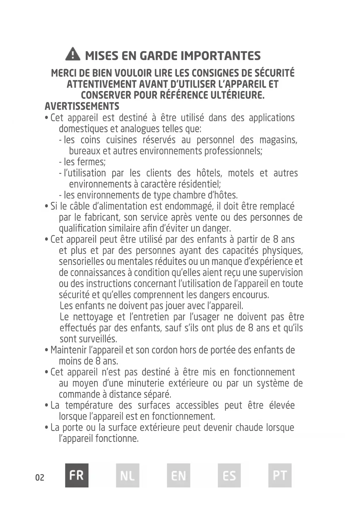- Cet appareil peut être utilisé par des enfants à partir de 8 ans et plus et par des personnes ayant des capacités physiques, sensorielles ou mentales réduites ou un manque d’expérience et de connaissances à condition qu’elles aient reçu une supervision ou des instructions concernant l’utilisation de l’appareil en toute sécurité et qu’elles comprennent les dangers encourus. Les enfants ne doivent pas jouer avec l’appareil. Le nettoyage et l’entretien par l’usager ne doivent pas être eectués par des enfants, sauf s’ils ont plus de 8 ans et qu’ils sont surveillés.