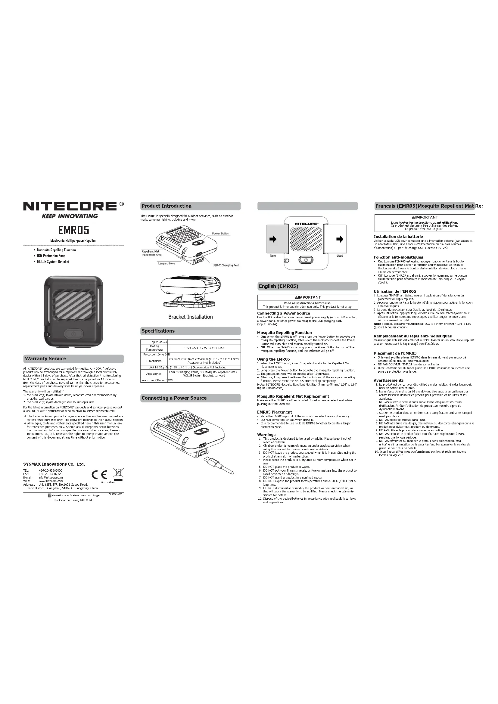 désactiver la fonction anti-moustique. Veuillez ranger l'EMR05 après refroidissement complet. Note : Taille du tapis anti-moustiques NITECORE : 34mm x 48mm / 1.34'' x 1.89'' (jusqu'à 6 heures chacun) Remplacement du tapis anti-moustiques S'assurer que l'EMR05 est éteint et refroidi. Insérer un nouveau tapis répulsif tout en repoussant le tapis usagé vers l’extérieur. Placement de l’EMR05