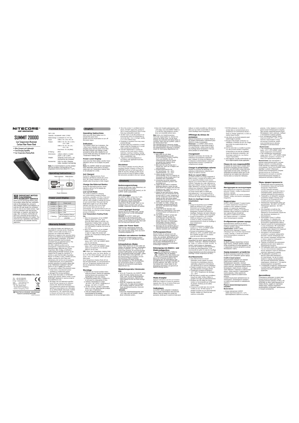SUMMIT 20000 - Chargeur de piles Nitecore - Notice d'utilisation et mode d'emploi gratuit