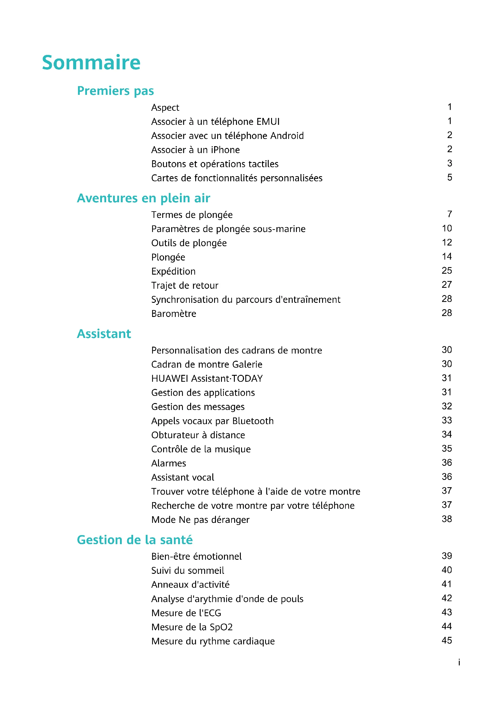 Sommaire iiPremiers pas Aspect Aspect ❶ Bouton d'assistance ❷ Microphone ❸ Bouton Haut ❹ Bouton Bas ❺ Haut-parleur ❻ Capteur de rythme cardiaque ❼ Zone de recharge Associer à un téléphone EMUI 1 Installez l'application Huawei Santé (