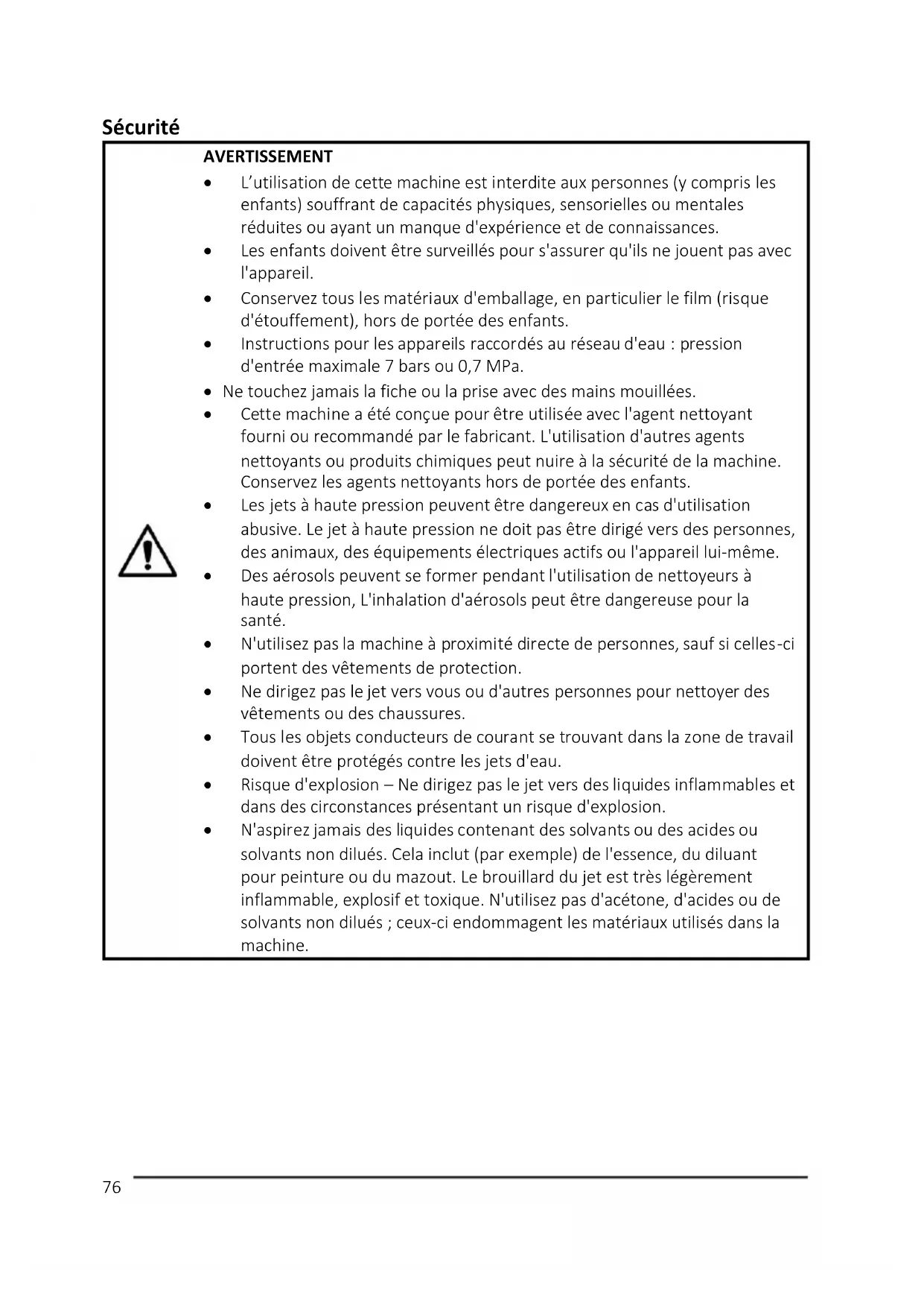 - N'aspirez jamais des liquides contenant des solvants ou des acides ou solvants non dilués. Cela inclut (par exemple) de l'essence, du diluant pour peinture ou du mazout. Le brouillard du jet est très légèrement inflammable, explosif et toxique. N'utilisez pas d'acétone, d'acides ou de solvants non dilués ; ceux-ci endommagent les matériaux utilisés dans la machine.77