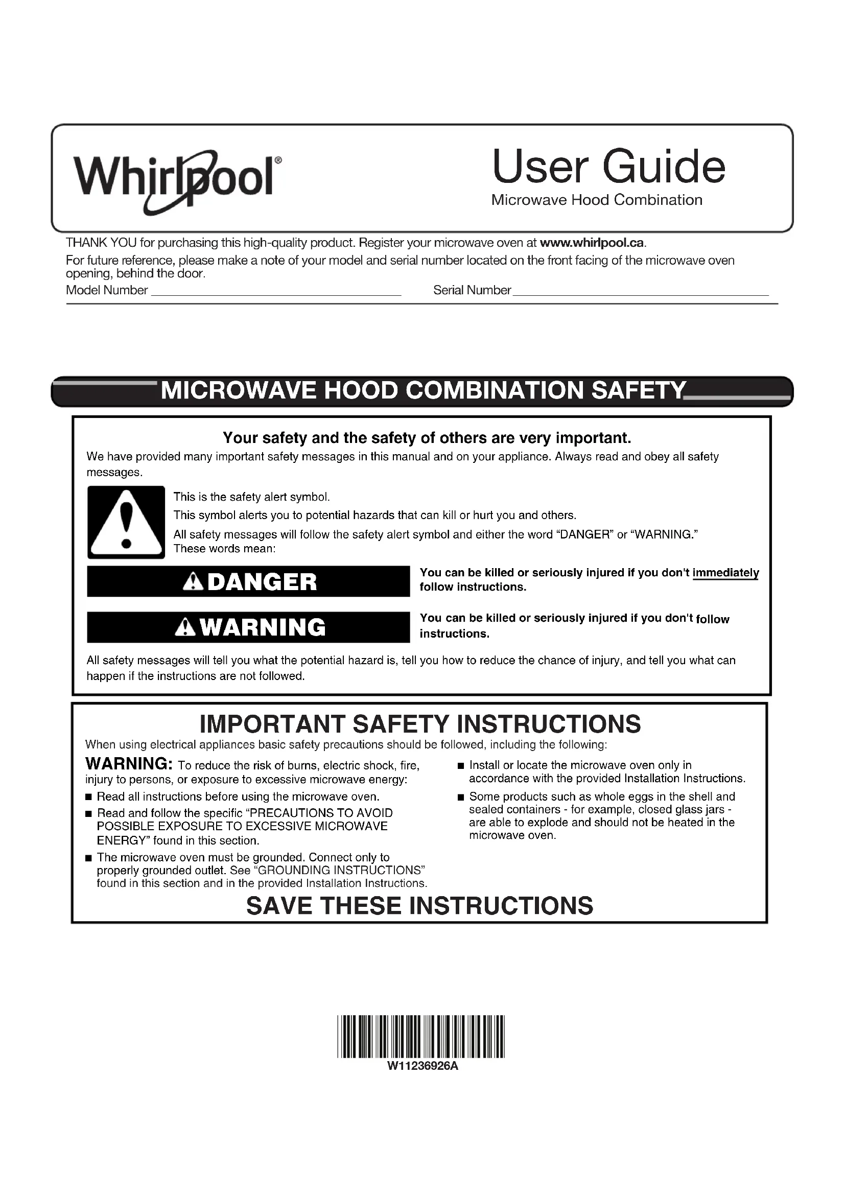 determined.The cost of repair or replacement under these excluded circumstances shall be borne by the customer. DISCLAIMER OF IMPLIED WARRANTIESIMPLIED WARRANTIES, INCLUDING ANY IMPLIED WARRANTY OF MERCHANTABILITY OR IMPLIED WARRANTY OF FITNESS FOR A PARTICULAR PURPOSE, ARE LIMITED TO ONE YEAR OR THE SHORTEST PERIOD ALLOWED BY LAW. Some states and provinces do not allow limitations on the duration of implied warranties of merchantability or fitness, so this limitation may not apply to you. This warranty gives you specific legal rights, and you also may have other rights that vary from state to state or province to province.DISCLAIMER OF REPRESENTATIONS OUTSIDE OF WARRANTY Whirlpool makes no representations about the quality, durability, or need for service or repair of this major appliance other than the representations contained in this warranty. If you want a longer or more comprehensive warranty than the limited warranty that comes with this major appliance, you should ask Whirlpool or your retailer about buying an extended warranty.LIMITATION OF REMEDIES: EXCLUSION OF INCIDENTAL AND CONSEQUENTIAL DAMAGESYOUR SOLE AND EXCLUSIVE REMEDY UNDER THIS LIMITED WARRANTY SHALL BE PRODUCT REPAIR AS PROVIDED HEREIN. WHIRLPOOL SHALL NOT BE LIABLE FOR INCIDENTAL OR CONSEQUENTIAL DAMAGES. Some states and provinces do not allow the exclusion or limitation of incidental or consequential damages, so these limitations and exclusions may not apply to you. This warranty gives you specific legal rights, and you also may have other rights that vary from state to state or province to province.Guide d’utilisation Ensemble hotte/four à micro-ondes Nous vous REMERCIONS d’avoir acheté ce produit de haute qualité. Enregistrez votre four à micro-ondes au www.whirlpool.ca. Pour référence ultérieure, consignez par écrit les numéros de modèle et de série situés sur la partie avant face à l’ouverture du four à micro-ondes, derrière la porte. Numéro de modèle _____________________________________ Numéro de série ________________________________________ SÉCURITÉ DE L’ENSEMBLE HOTTE/FOUR À MICRO-ONDES Risque possible de décès ou de blessure grave si vous ne suivez pas immédiatement les instructions. Risque possible de décès ou de blessure grave si vous ne suivez pas les instructions. Tous les messages de sécurité vous diront quel est le danger potentiel et vous disent comment réduire le risque de blessure et ce qui peut se produire en cas de non-respect des instructions. Votre sécurité et celle des autres est très importante. Nous donnons de nombreux messages de sécurité importants dans ce manuel et sur votre appareil ménager. Assurez-vous de toujours lire tous les messages de sécurité et de vous y conformer. AVERTISSEMENT DANGER Voici le symbole d’alerte de sécurité.Ce symbole d’alerte de sécurité vous signale les dangers potentiels de décès et de blessures graves à vous et à d’autres.Tous les messages de sécurité suivront le symbole d’alerte de sécurité et le mot “DANGER” ou “AVERTISSEMENT”. Ces mots signifient : Lors de l’utilisation de tout appareil ménager électrique on doit observer certaines précautions de sécurité fondamentales, dont les suivantes :