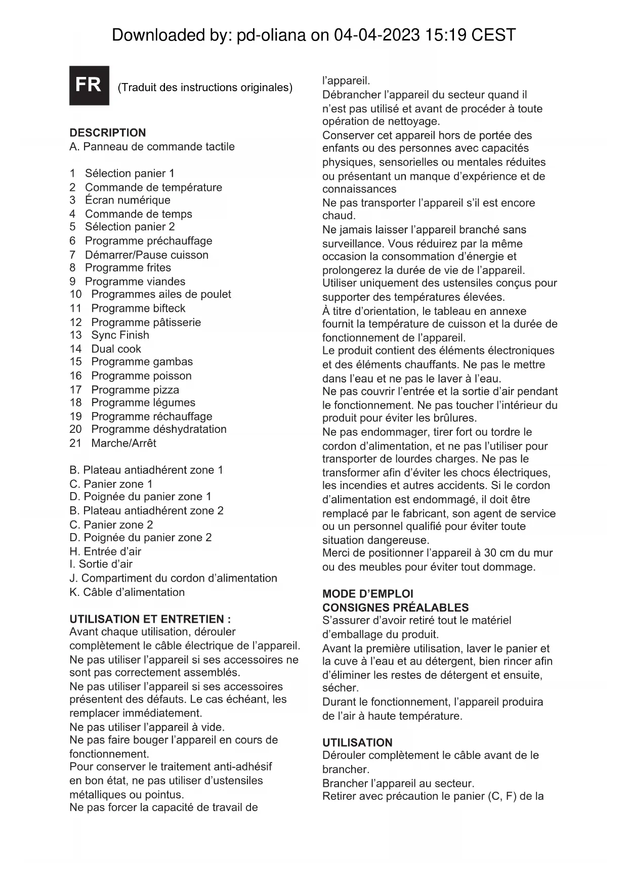 La FRITEUSE À AIR ne fonctionne pas. L’appareil n’est pas branché. Brancher l'appareil à une prise de terre. La minuterie n'est pas réglée. Pour allumer l'appareil, régler la minuterie sur le temps de préparation requis. Les aliments frits dans ne sont pas complètement cuits. La quantité de nourriture placée dans le panier est excessive. Mettre moins d'ingrédients dans le panier. Les petites quantités sont plus faciles à secouer et permettent une friture uniforme. La température sélectionnée est trop basse. Augmenter la température jusqu'à atteindre la position appropriée. Réglage de la température : voir le guide de cuisson. La friture n’est pas uniforme. Certains ingrédients doivent être agités à la moitié du temps de préparation. Lorsque les aliments sont superposés (par exemple, des frites), ils doivent être remués à la moitié du temps de préparation. Les frites ne sont pas croustillantes. Mauvais type d'aliment utilisé. Consulter la méthode de préparation des aliments du fabricant. Panier surchargé. Ne pas remplir le panier au-dessus de l'indication MAX. La casserole/panier ne peut pas être inséré(e) dans l’appareil. Le panier n'est pas placé correctement dans la cuve. Appuyer sur le panier dans la casserole jusqu'à entendrez un déclic. De la fumée blanche sort de l'appareil. Des ingrédients riches en huile sont en cours de préparation. De l'huile a été ajoutée à la préparation. Ne pas utiliser d'aliments riches en huile ou ne pas ajouter d'huile plus que strictement nécessaire. Cette friteuse utilise une technologie qui nécessite peu ou pas d'huile. La casserole contient encore des traces de graisse de l'utilisation précédente. La fumée blanche est causée par la graisse qui chauffe dans la cuve. Downloaded by: pd-oliana on 04-04-2023 15:19 CESTPT (Traduzido das instruções originais) DESCRIÇÃO A Painel de controlo digital 1 Seleção do cesto 1 2 Controlo da temperatura 3 Ecrã digital 4 Controlo do tempo 5 Seleção do cesto 2 6 Programa de preaquecimento 7 Início / Pausa de funcionamento 8 Programa para batatas fritas 9 Programa para carne 10 Programa para asinhas de frango 11 Programa para letes 12 Programa para pastelaria 13 Sync Finish 14 Dual Cook 15 Programa para gambas 16 Programa para peixe 17 Programa para pizza 18 Programa para legumes 19 Programa para reaquecer 20 Programa para desidratar 21 Ligar/Desligar B Tabuleiro antiaderente zona 1 C Cesto da zona 1 D Asa do cesto da zona 1 B Tabuleiro antiaderente zona 2 C Cesto da zona 2 D Asa do cesto da zona 2 H Entrada de ar I Saída de ar J Alojamento do cabo de alimentação K Cabo de alimentação