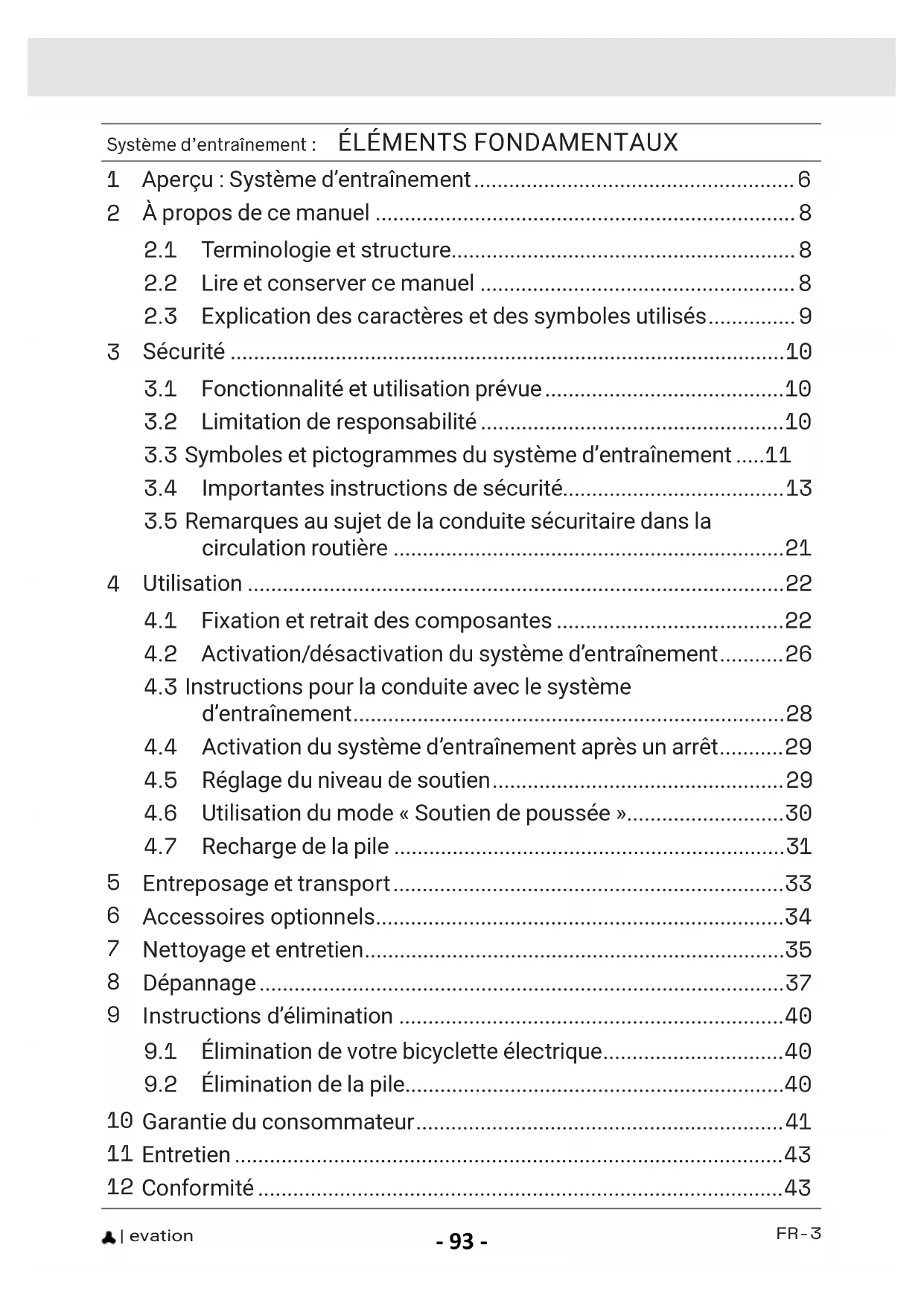 ANSI. Avant d’utiliser le système d’entraînement pour la première fois, assu- rez-vous de lire le manuel en entier – surtout le chapitre sur la « Sécurité » – attentivement. Omettre de suivre ces instructions pourrait occasionner des blessures graves ou des dommages au système d’entraînement ou aux composants individuels. Conservez toujours ce manuel à portée de main pour une utilisation ultérieure et remettez-le si vous remettez le système d’entraînement ou la bicyclette électrique équipée à un tiers. En plus de ce manuel pour le système d’entraînement, respectez toujours les instructions du fabricant FAZUA Original_Instrucion_FR_CA.indb 8FAZUA Original_Instrucion_FR_CA.indb 8 28-Feb-20 12:41:3628-Feb-20 12:41:36 - 98 -FR-9 | evation de la bicyclette électrique sur lequel le système d’entraînement est installé. La marque et les logos Bluetooth