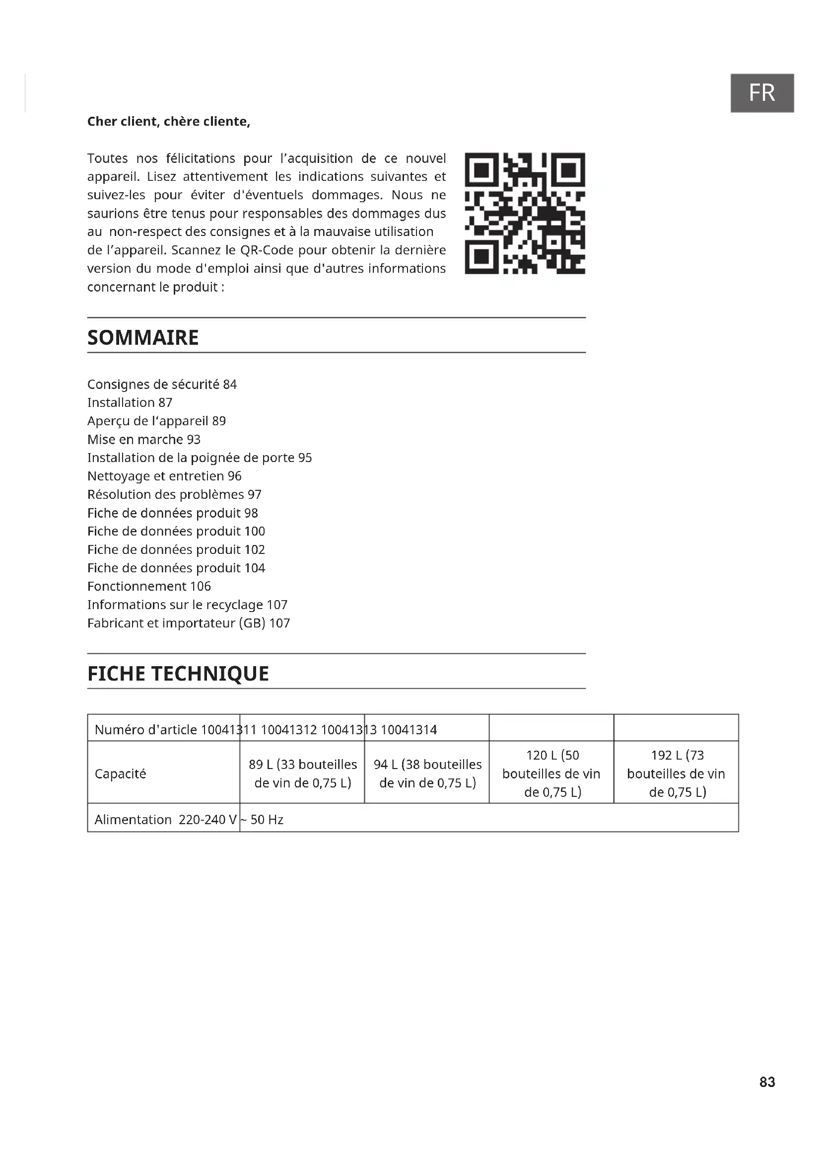 Cher client, chère cliente, Toutes nos félicitations pour l’acquisition de ce nouvel appareil. Lisez attentivement les indications suivantes et suivez-les pour éviter d'éventuels dommages. Nous ne saurions être tenus pour responsables des dommages dus au non-respect des consignes et à la mauvaise utilisation de l’appareil. Scannez le QR-Code pour obtenir la dernière version du mode d'emploi ainsi que d'autres informations concernant le produit : SOMMAIRE Consignes de sécurité 84 Installation 87 Aperçu de l‘appareil 89 Mise en marche 93 Installation de la poignée de porte 95 Nettoyage et entretien 96 Résolution des problèmes 97 Fiche de données produit 98 Fiche de données produit 100 Fiche de données produit 102 Fiche de données produit 104 Fonctionnement 106 Informations sur le recyclage 107 Fabricant et importateur (GB) 107 FICHE TECHNIQUE Numéro d'article 10041311 10041312 10041313 10041314 Capacité 89 L (33 bouteilles de vin de 0,75 L) 94 L (38 bouteilles de vin de 0,75 L) 120 L (50 bouteilles de vin de 0,75 L) 192 L (73 bouteilles de vin de 0,75 L) Alimentation 220-240 V ~ 50 Hz84