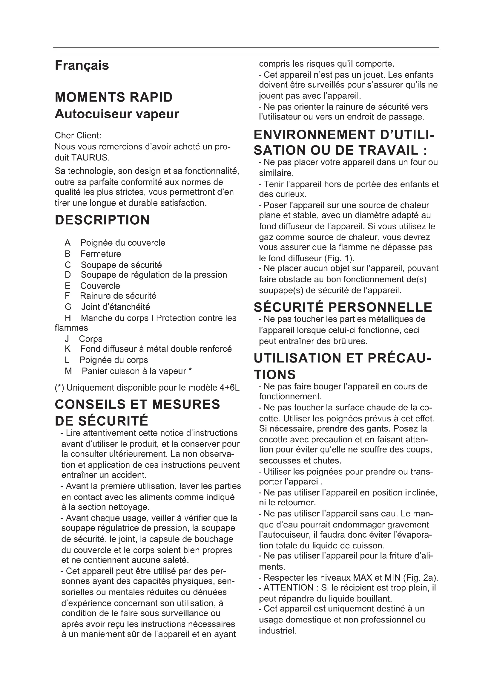PRODUCT - The materials of which the packaging of this appliance consists are included in a collec- tion, classication and recycling system. Should you wish to dispose of them, use the appropriate public containers for each type of material. - The product does not contain concentrations of substances that could be considered harm- ful to the environment. This appliance complies with Directive 2014/68/EU concerning pressure equipment.Français MOMENTS RAPID Autocuiseur vapeur Cher Client: Nous vous remercions d’avoir acheté un pro- duit TAURUS. Sa technologie, son design et sa fonctionnalité, outre sa parfaite conformité aux normes de qualité les plus strictes, vous permettront d’en tirer une longue et durable satisfaction. DESCRIPTION A Poignée du couvercle B Fermeture C Soupape de sécurité D Soupape de régulation de la pression E Couvercle F Rainure de sécurité G Joint d’étanchéité H Manche du corps I Protection contre les ammes J Corps K Fond diuseur à métal double renforcé L Poignée du corps M Panier cuisson à la vapeur * (*) Uniquement disponible pour le modèle 4+6L