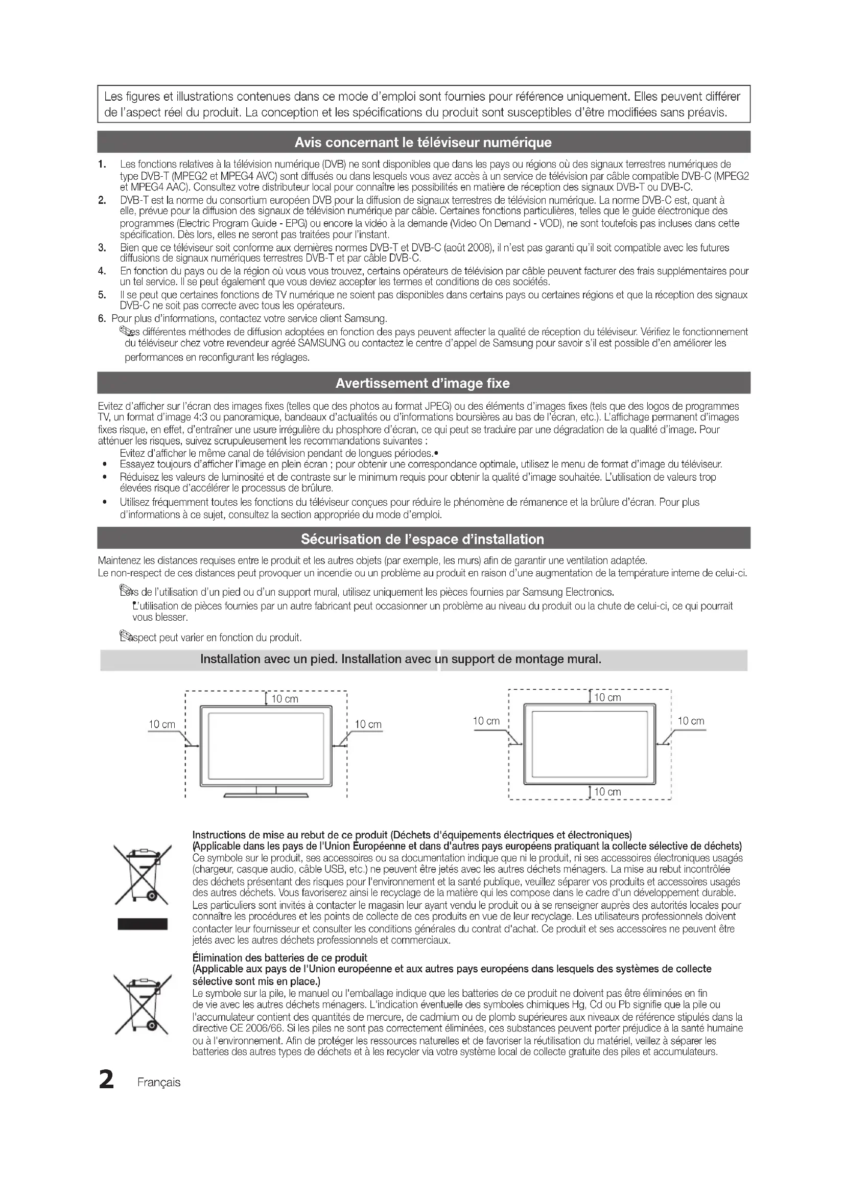 Wall Mount 55 Warm 17 White Balance 17 BN68-02808A_Eng.indb 61 2010-03-28 12:57:49This page is intentionally left blank. BN68-02808A_Eng.indb 62 2010-03-28 12:57:492 Français Les figures et illustrations contenues dans ce mode d’emploi sont fournies pour référence uniquement. Elles peuvent différer de l’aspect réel du produit. La conception et les spécifications du produit sont susceptibles d’être modifiées sans préavis. Avis concernant le téléviseur numérique 1. Les fonctions relatives à la télévision numérique (DVB) ne sont disponibles que dans les pays ou régions où des signaux terrestres numériques de type DVB-T (MPEG2 et MPEG4 AVC) sont diffusés ou dans lesquels vous avez accès à un service de télévision par câble compatible DVB-C (MPEG2 et MPEG4 AAC). Consultez votre distributeur local pour connaître les possibilités en matière de réception des signaux DVB-T ou DVB-C. 2. DVB-T est la norme du consortium européen DVB pour la diffusion de signaux terrestres de télévision numérique. La norme DVB-C est, quant à elle, prévue pour la diffusion des signaux de télévision numérique par câble. Certaines fonctions particulières, telles que le guide électronique des programmes (Electric Program Guide - EPG) ou encore la vidéo à la demande (Video On Demand - VOD), ne sont toutefois pas incluses dans cette spécification. Dès lors, elles ne seront pas traitées pour l’instant. 3. Bien que ce téléviseur soit conforme aux dernières normes DVB-T et DVB-C (août 2008), il n’est pas garanti qu’il soit compatible avec les futures diffusions de signaux numériques terrestres DVB-T et par câble DVB-C. 4. En fonction du pays ou de la région où vous vous trouvez, certains opérateurs de télévision par câble peuvent facturer des frais supplémentaires pour un tel service. Il se peut également que vous deviez accepter les termes et conditions de ces sociétés. 5. Il se peut que certaines fonctions de TV numérique ne soient pas disponibles dans certains pays ou certaines régions et que la réception des signaux DVB-C ne soit pas correcte avec tous les opérateurs.