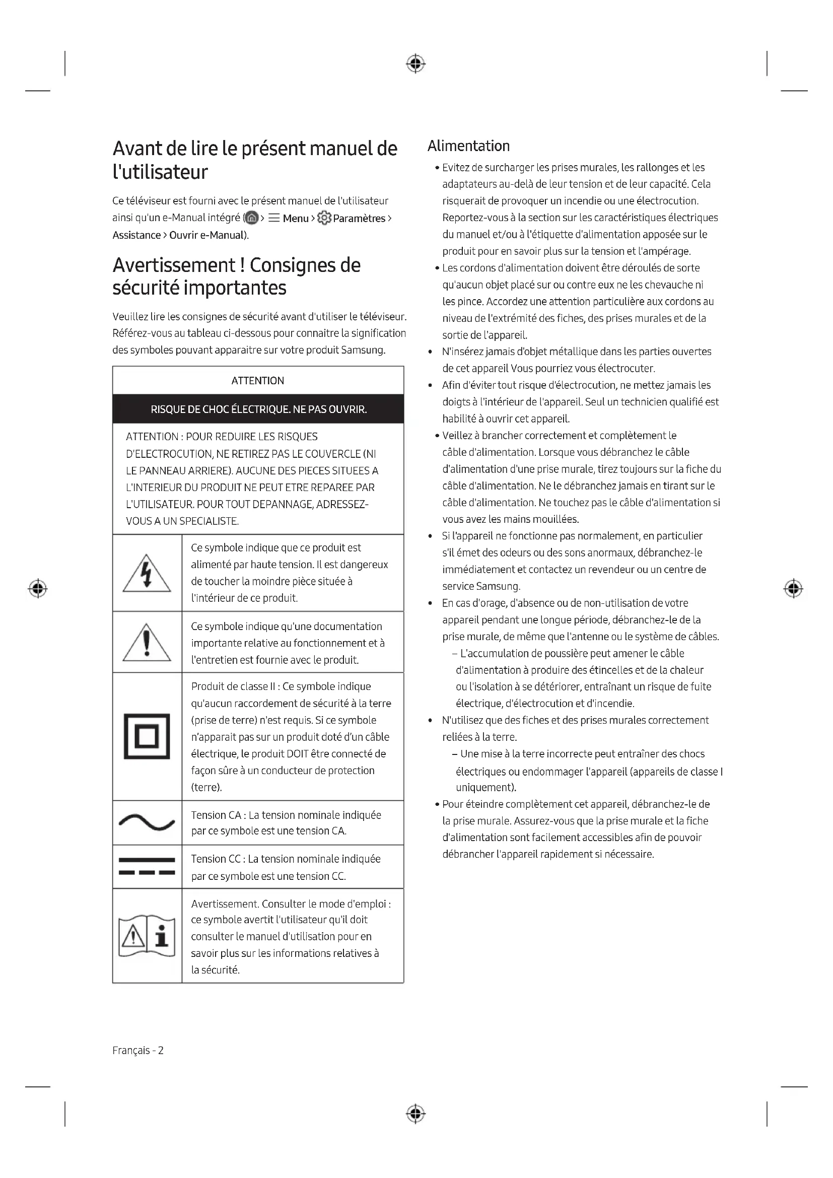 - For your safety, you must not attempt to remove the battery. If the battery is not properly removed, it may lead to damage to the battery and device, cause personal injury, and/or result in the device being unsafe. English - 9 EnglishAvant de lire le présent manuel de l'utilisateur Ce téléviseur est fourni avec le présent manuel de l'utilisateur ainsi qu'un e-Manual intégré ( > Menu > Paramètres > Assistance > Ouvrir e-Manual). Avertissement! Consignes de sécurité importantes Veuillez lire les consignes de sécurité avant d'utiliser le téléviseur. Référez-vous au tableau ci-dessous pour connaitre la signification des symboles pouvant apparaitre sur votre produit Samsung. ATTENTION RISQUE DE CHOC ÉLECTRIQUE. NE PAS OUVRIR.