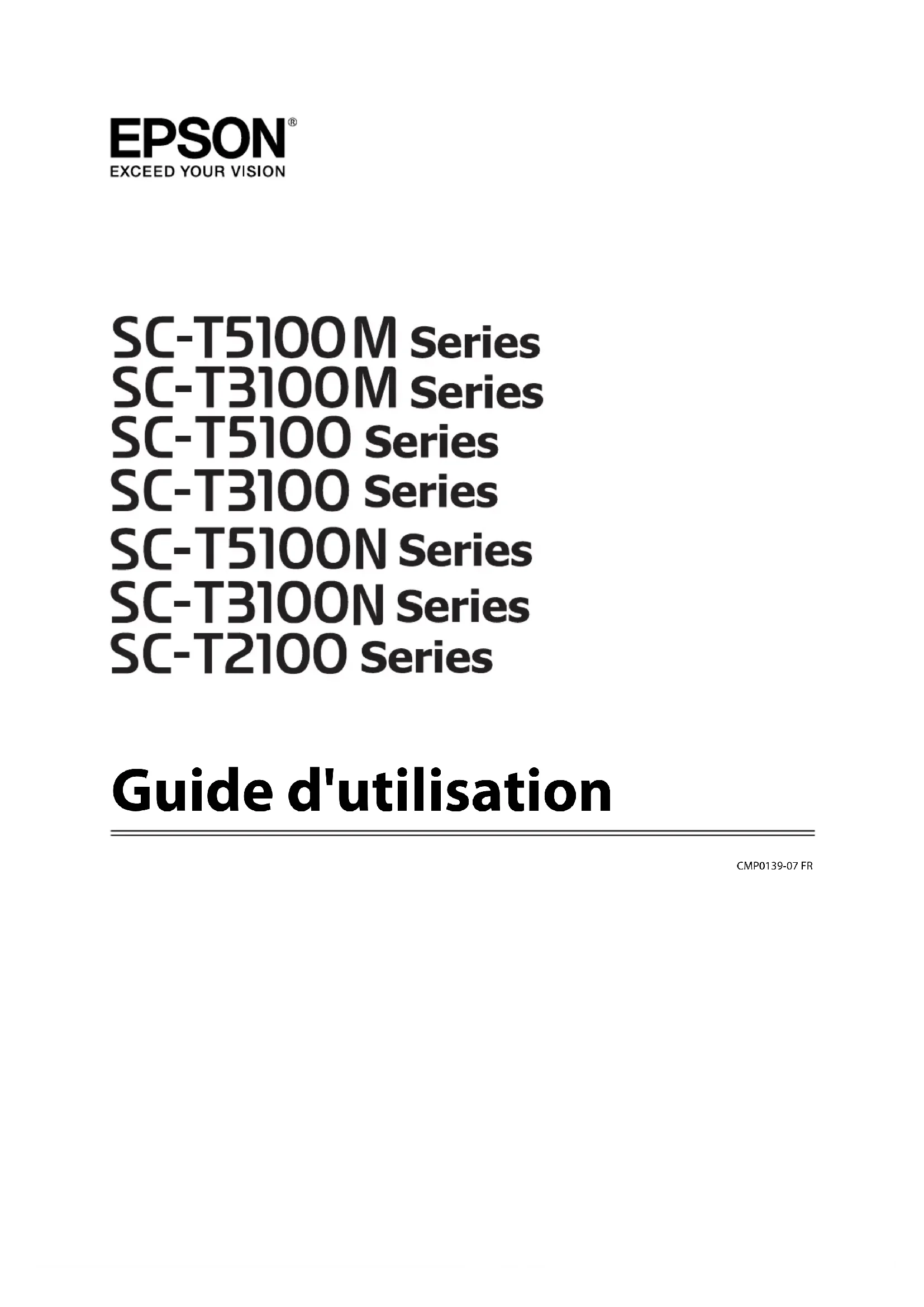 - are registered trademarks of Hewlett-Packard Corporation. Avis général : les autres noms de produits utilisés ici sont uniquement à des fins d’identification et peuvent être des marques de commerce de leurs propriétaires respectifs. Epson décline tous droits sur ces marques. © 2021 Seiko Epson Corporation. SC-T5100M/SC-T3100M/SC-T5100/SC-T3100/SC-T5100N/SC-T3100N/SC-T2100 Series Guide d'utilisation Droits d’auteur et marques déposées 2Table des matières Droits d’auteur et marques déposées Introduction Remarques sur les manuels p. 7