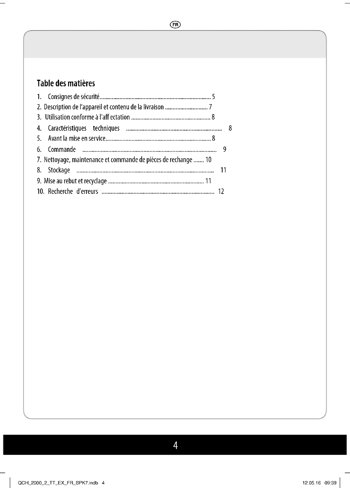 L‘appareil se trouve dans un emballage permettant d‘éviter les dommages dus au transport. Cet emballage est une matière première et peut donc être réutilisé ultérieurement ou être réintroduit dans le circuit des matières premières. L‘appareil et ses accessoires sont en matériaux divers, comme par ex. des métaux et ma- tières plastiques. Les appareils défectueux ne doivent pas être jetés dans les poubelles domestiques. Pour une mise au rebut conforme à la réglementation, l‘appareil doit être déposé dans un centre de collecte approprié. Si vous ne connaissez pas de centre de collecte, veuillez vous renseigner auprès de l‘administration de votre commune. QCH_2000_2_TT_EX_FR_SPK7.indb 11QCH_2000_2_TT_EX_FR_SPK7.indb 11 12.05.16 09:3912.05.16 09:39s