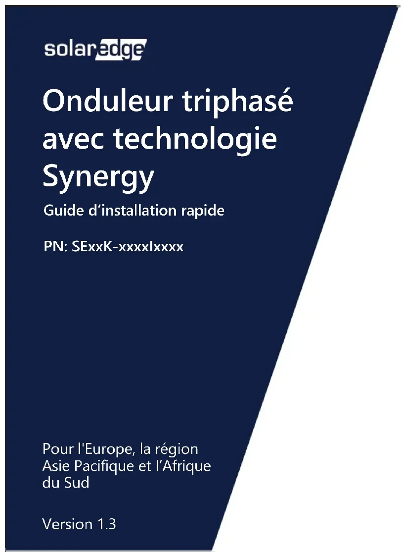 LED-indicaties 18Support Contact Informatie Bij technische problemen met SolarEdge producten kunt u contact met ons opnemen: https://www.solaredge.com/service/support Wijzigingen voorbehouden zonder voorafgaande . Copyright © SolarEdge Inc. Alle rechten voorbehouden. Maart 2021.Onduleur triphasé avec technologie Synergy Guide d’installation rapide PN: SExxK-xxxxIxxxx Pour l'Europe, la région Asie Pacifique et l’Afrique du Sud Version 1.3REMARQUE Ce symbole indique que les informations ont pour but d'aider l'utilisateur à optimiser son utilisation du produit. Ce symbole apparaît aux points de mise à la terre sur l’équipement et dans les manuels SolarEdge. ATTENTION! Indique un danger. Ce symbole attire l’attention sur une procédure qui, si elle n’est pas correctement effectuée ou respectée, peut entraîner des dommages ou la destruction du produit. Ne passez pas au-delà d’un signe d’attention jusqu’à ce que les conditions indiquées soient pleinement comprises et respectées. Mettez l'interrupteur CA de la carte de circuit principale sur ON/OFF et attendez 5 minutes AVERTISSEMENT! Indique un danger. Ce symbole attire l’attention sur une procédure qui, si elle n’est pas correctement effectuée ou respectée, peut entraîner des blessures ou le décès. Ne poursuivez pas au-delà d’une note d’avertissement tant que les conditions indiquées ne sont pas pleinement comprises et respectées. Mettez l'interrupteur de sécurité CC du Synergy Manager sur ON/OFF et attendez 5 minutes (Applicable uniquement aux modèles équipés d'un interrupteur de sécurité DC) Ne coupez pas les connecteurs du câble