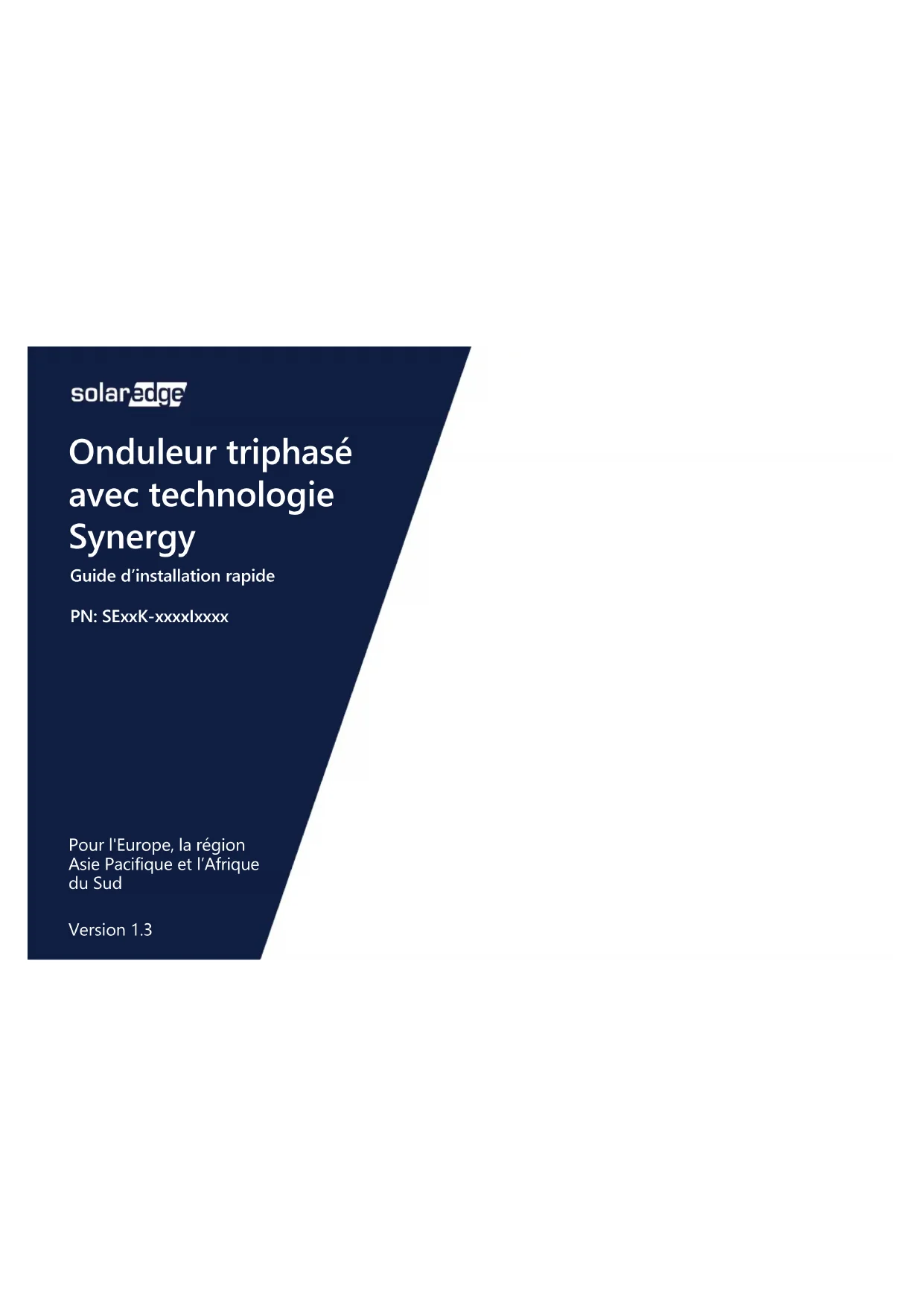 LED-indicaties 18Support Contact Informatie Bij technische problemen met SolarEdge producten kunt u contact met ons opnemen: https://www.solaredge.com/service/support Wijzigingen voorbehouden zonder voorafgaande . Copyright © SolarEdge Inc. Alle rechten voorbehouden. Maart 2021.Onduleur triphasé avec technologie Synergy Guide d’installation rapide PN: SExxK-xxxxIxxxx Pour l'Europe, la région Asie Pacifique et l’Afrique du Sud Version 1.3REMARQUE Ce symbole indique que les informations ont pour but d'aider l'utilisateur à optimiser son utilisation du produit. Ce symbole apparaît aux points de mise à la terre sur l’équipement et dans les manuels SolarEdge. ATTENTION! Indique un danger. Ce symbole attire l’attention sur une procédure qui, si elle n’est pas correctement effectuée ou respectée, peut entraîner des dommages ou la destruction du produit. Ne passez pas au-delà d’un signe d’attention jusqu’à ce que les conditions indiquées soient pleinement comprises et respectées. Mettez l'interrupteur CA de la carte de circuit principale sur ON/OFF et attendez 5 minutes AVERTISSEMENT! Indique un danger. Ce symbole attire l’attention sur une procédure qui, si elle n’est pas correctement effectuée ou respectée, peut entraîner des blessures ou le décès. Ne poursuivez pas au-delà d’une note d’avertissement tant que les conditions indiquées ne sont pas pleinement comprises et respectées. Mettez l'interrupteur de sécurité CC du Synergy Manager sur ON/OFF et attendez 5 minutes (Applicable uniquement aux modèles équipés d'un interrupteur de sécurité DC) Ne coupez pas les connecteurs du câble