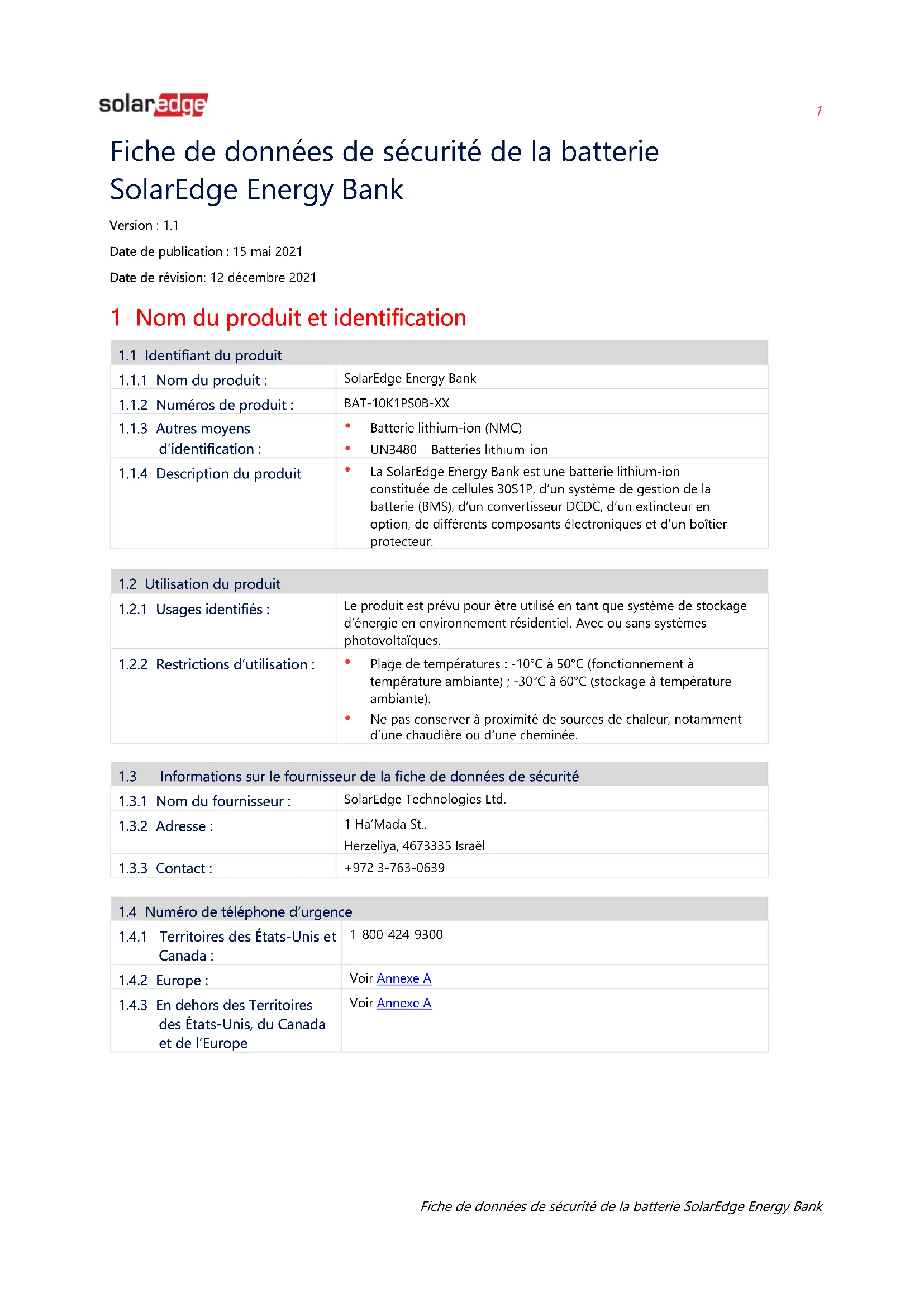 Fiche de données de sécurité de la batterie SolarEdge Energy Bank Fiche de données de sécurité de la batterie SolarEdge Energy Bank Version : 1.1 Date de publication : 15 mai 2021 Date de révision: 12 décembre 2021