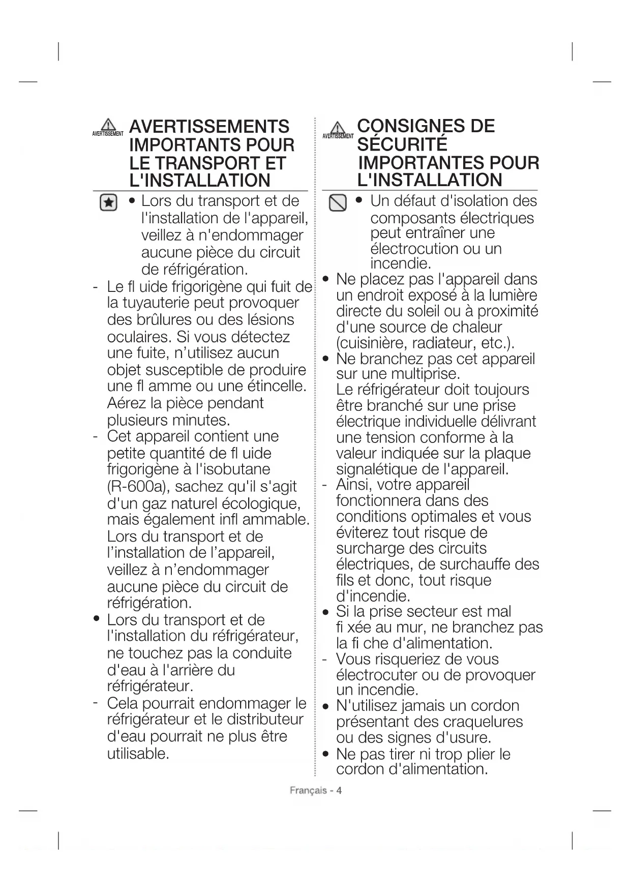 Un défaut d'isolation des composants électriques peut entraîner uneélectrocution ou un incendie. Ne placez pas l'appareil dans un endroit exposé à la lumière directe du soleil ou à proximité d'une source de chaleur (cuisinière, radiateur, etc.). Ne branchez pas cet appareil sur une multiprise.Le réfrigérateur doit toujours être branché sur une prise électrique individuelle délivrant une tension conforme à la valeur indiquée sur la plaque signalétique de l'appareil. Ainsi, votre appareil fonctionnera dans des conditions optimales et vous éviterez tout risque de surcharge des circuits électriques, de surchauffe des fi ls et donc, tout risque d'incendie. Si la prise secteur est mal fi xée au mur, ne branchez pas la fi che d'alimentation.Vous risqueriez de vous électrocuter ou de provoquer un incendie.N'utilisez jamais un cordon présentant des craquelures ou des signes d'usure. Ne pas tirer ni trop plier le cordon d'alimentation.