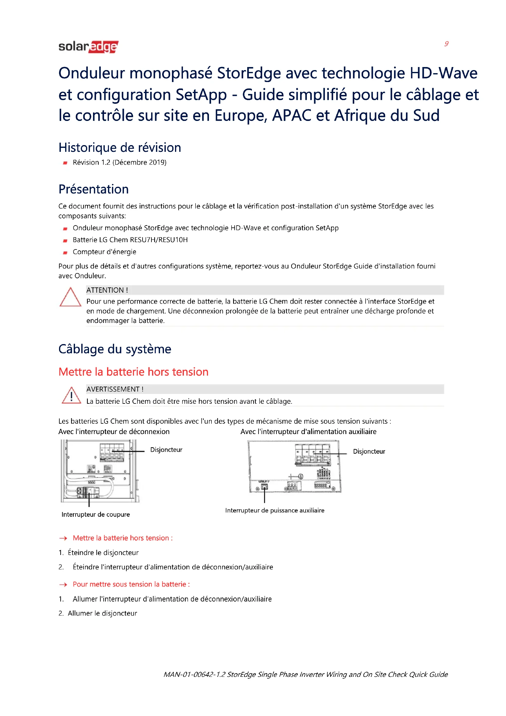 AVERTISSEMENT ! La batterie LG Chem doit être mise hors tension avant le câblage. Les batteries LG Chem sont disponibles avec l'un des types de mécanisme de mise sous tension suivants : Avec l'interrupteur de déconnexion Avec l'interrupteur d'alimentation auxiliaire