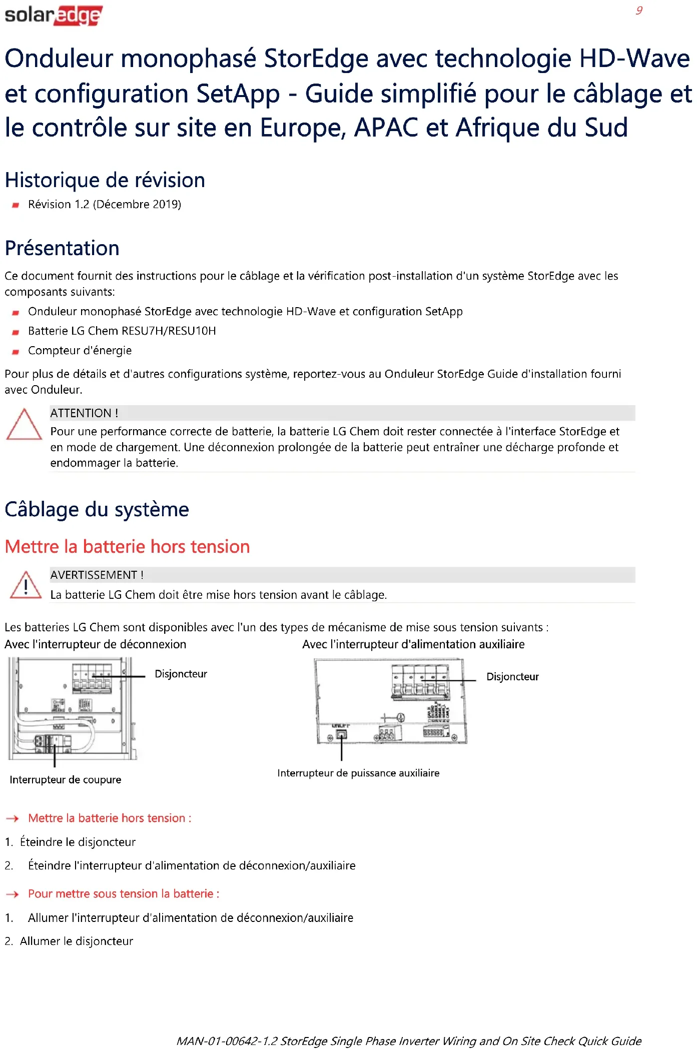 Disjoncteur Disjoncteur Interrupteur de coupure Interrupteur de puissance auxiliaire10 Câblage du système MAN-01-00642-1.2 StorEdge Single Phase Inverter Wiring and On Site Check Quick Guide Connexion des composants du système Connecter les composants du système comme indiqué dans le schéma ci-dessous. Faites attention à : Types de câbles Configuration de l'interrupteur DIP Si aucun compteur d’énergie n’est connecté à l'onduleur, placer le commutateur DIP de gauche sur ON afin de terminer le bus RS485. B A G En Onduleur Compteur d énergie B- <> B- and A+ <> A+ sur la même paire torsadée Batterie LG Chem RS485_H <> A+ et RS485_L <> B- sur la même paire torsadée ENABLE_H <> EnEN_GND <> G DIP gauche > OFF DIP 2 > ON 3 paires torsadées de câble blindé,