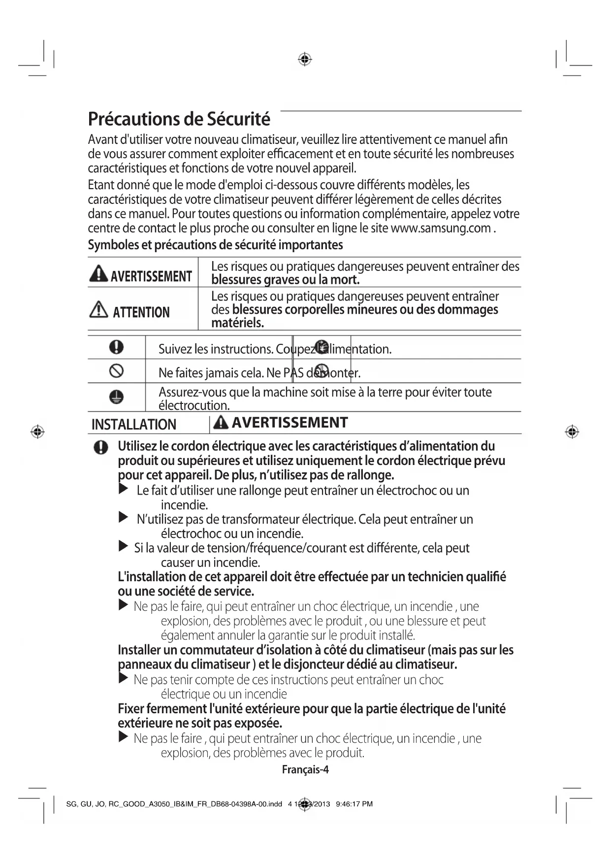 - Comment faire pour connecter les rallonges de câbles d’alimentation SG, GU, JO, RC_GOOD_A3050_IB&IM_FR_DB68-04398A-00.indd 3 12/23/2013 9:46:16 PMFrançais-4 Précautions de Sécurité Avant d'utiliser votre nouveau climatiseur, veuillez lire attentivement ce manuel an de vous assurer comment exploiter ecacement et en toute sécurité les nombreuses caractéristiques et fonctions de votre nouvel appareil. Etant donné que le mode d'emploi ci-dessous couvre diérents modèles, les caractéristiques de votre climatiseur peuvent diérer légèrement de celles décrites dans ce manuel. Pour toutes questions ou information complémentaire, appelez votre centre de contact le plus proche ou consulter en ligne le site www.samsung.com . Symboles et précautions de sécurité importantes AVERTISSEMENT Les risques ou pratiques dangereuses peuvent entraîner des blessures graves ou la mort. ATTENTION Les risques ou pratiques dangereuses peuvent entraîner des blessures corporelles mineures ou des dommages matériels. Suivez les instructions. Coupez l’alimentation. Ne faites jamais cela. Ne PAS démonter. Assurez-vous que la machine soit mise à la terre pour éviter toute électrocution. INSTALLATION AVERTISSEMENT Utilisez le cordon électrique avec les caractéristiques d’alimentation du produit ou supérieures et utilisez uniquement le cordon électrique prévu pour cet appareil. De plus, n’utilisez pas de rallonge. p. 51