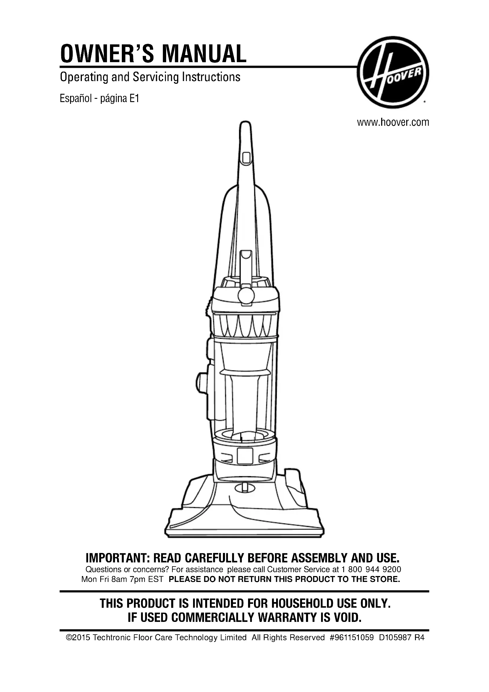 D’UTILISER L’ASPIRATEUR. Vous avez des questions ou des inquiétudes? Veuillez appeler le service à la clientèle au 1 800 9449200 du lundi au vendredi de 8 h à 19 h (HNE) VEUILLEZ NE PAS RETOURNER CE PRODUIT AU MAGASIN.Merci d’avoir choisi un produit HOOVER