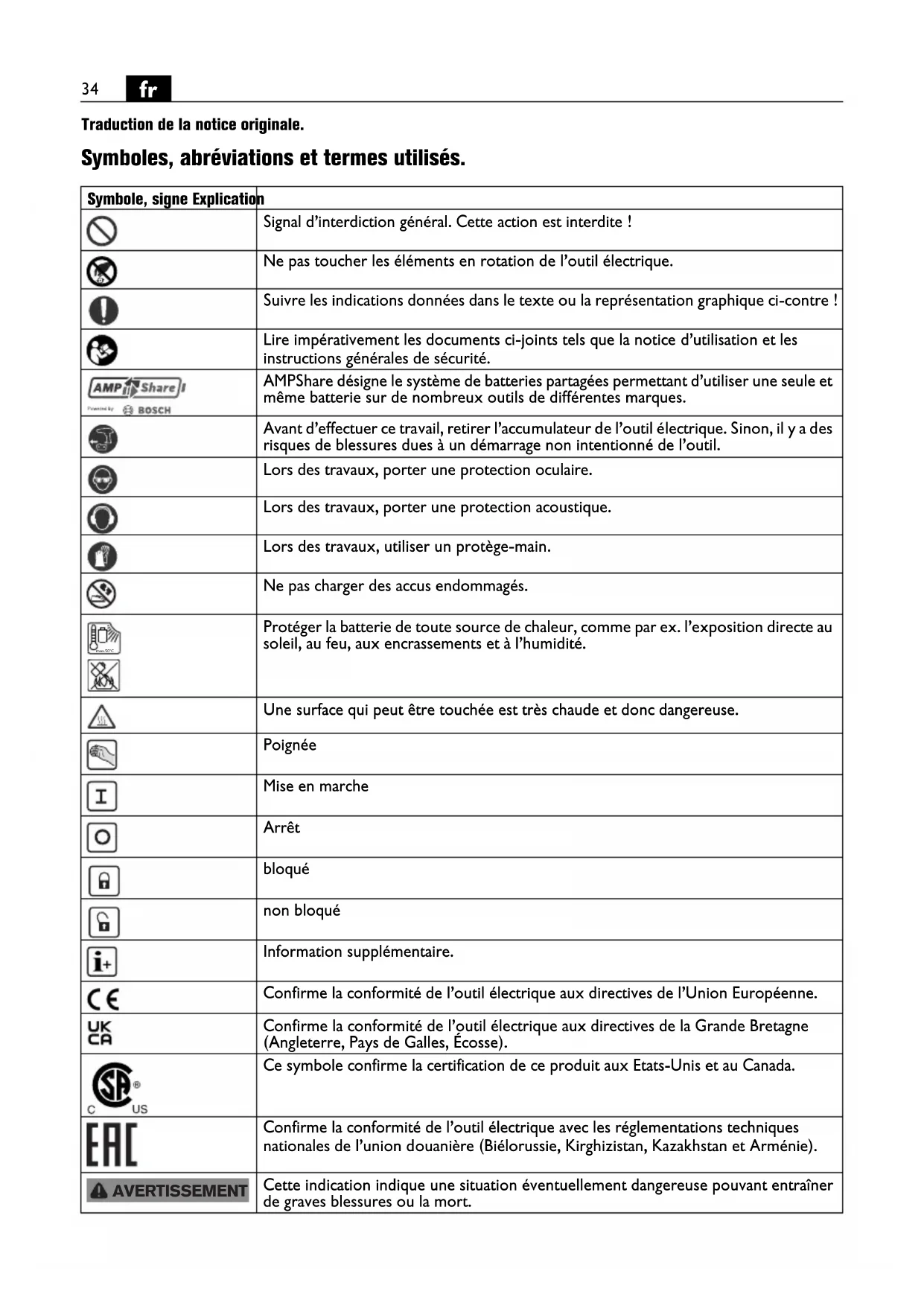 Traduction de la notice originale. Symboles, abréviations et termes utilisés. Symbole, signe Explication Signal d’interdiction général. Cette action est interdite ! Ne pas toucher les éléments en rotation de l’outil électrique. Suivre les indications données dans le texte ou la représentation graphique ci-contre ! Lire impérativement les documents ci-joints tels que la notice d’utilisation et les instructions générales de sécurité. AMPShare désigne le système de batteries partagées permettant d’utiliser une seule et même batterie sur de nombreux outils de différentes marques. Avant d’effectuer ce travail, retirer l’accumulateur de l’outil électrique. Sinon, il y a des risques de blessures dues à un démarrage non intentionné de l’outil. Lors des travaux, porter une protection oculaire. Lors des travaux, porter une protection acoustique. Lors des travaux, utiliser un protège-main. Ne pas charger des accus endommagés. Protéger la batterie de toute source de chaleur, comme par ex. l’exposition directe au soleil, au feu, aux encrassements et à l’humidité. Une surface qui peut être touchée est très chaude et donc dangereuse. Poignée Mise en marche Arrêt bloqué non bloqué Information supplémentaire. Confirme la conformité de l’outil électrique aux directives de l’Union Européenne. Confirme la conformité de l’outil électrique aux directives de la Grande Bretagne (Angleterre, Pays de Galles, Écosse). Ce symbole confirme la certification de ce produit aux Etats-Unis et au Canada. Confirme la conformité de l’outil électrique avec les réglementations techniques nationales de l’union douanière (Biélorussie, Kirghizistan, Kazakhstan et Arménie). Cette indication indique une situation éventuellement dangereuse pouvant entraîner de graves blessures ou la mort. max.50°C AVERTISSEMENT35