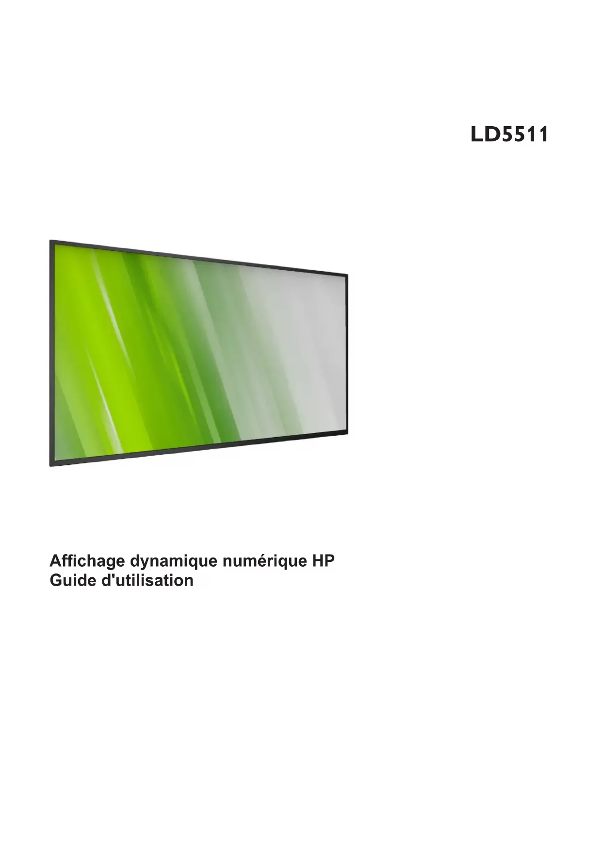 LD5511 Afchage dynamique numérique HP Guide d'utilisation© © 2015 HP Development Company, L.P. Avis relatif au produit Número da peça do documento: Les informations du présent document peuvent être modifiées sans préavis. Les seules garanties relatives aux produits et services HP sont décrites dans les documents de garantie expresse fournis avec ces produits et services. Aucun élément du présent document ne doit être interprété comme une garantie complémentaire d'aucune sorte. HP ne peut en aucun cas être tenu pour responsable des éventuelles omissions ou erreurs techniques ou éditoriales contenues dans ce document. Ce guide décrit les fonctionnalités communes à la plupart des modèles. Certaines fonctionnalités peuvent ne pas être disponibles sur le produit dont vous disposez. Pour accéder à la version la plus récente du manuel d'utilisation, rendez-vous sur le site http://www.hp.com/support et sélectionnez votre pays. Sélectionnez Pilotes et Téléchargements ou l'option équivalente, puis suivez les instructions à l'écran. Primeira edição: Fevereiro de 2016 843569-051 (c) Copyright 2016 HP Development Company, L.P.LD5511 iii Consignes de sécurité Avertissements et précautions