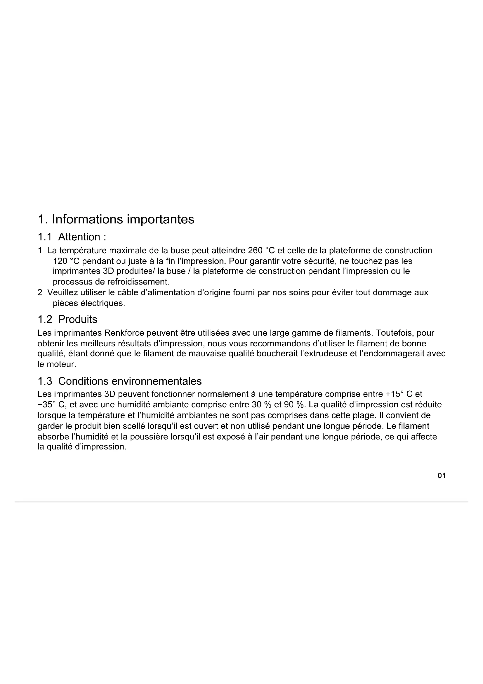 Les imprimantes Renkforce peuvent être utilisées avec une large gamme de filaments. Toutefois, pour obtenir les meilleurs résultats d’impression, nous vous recommandons d’utiliser le filament de bonne qualité, étant donné que le filament de mauvaise qualité boucherait l’extrudeuse et l’endommagerait avec le moteur.