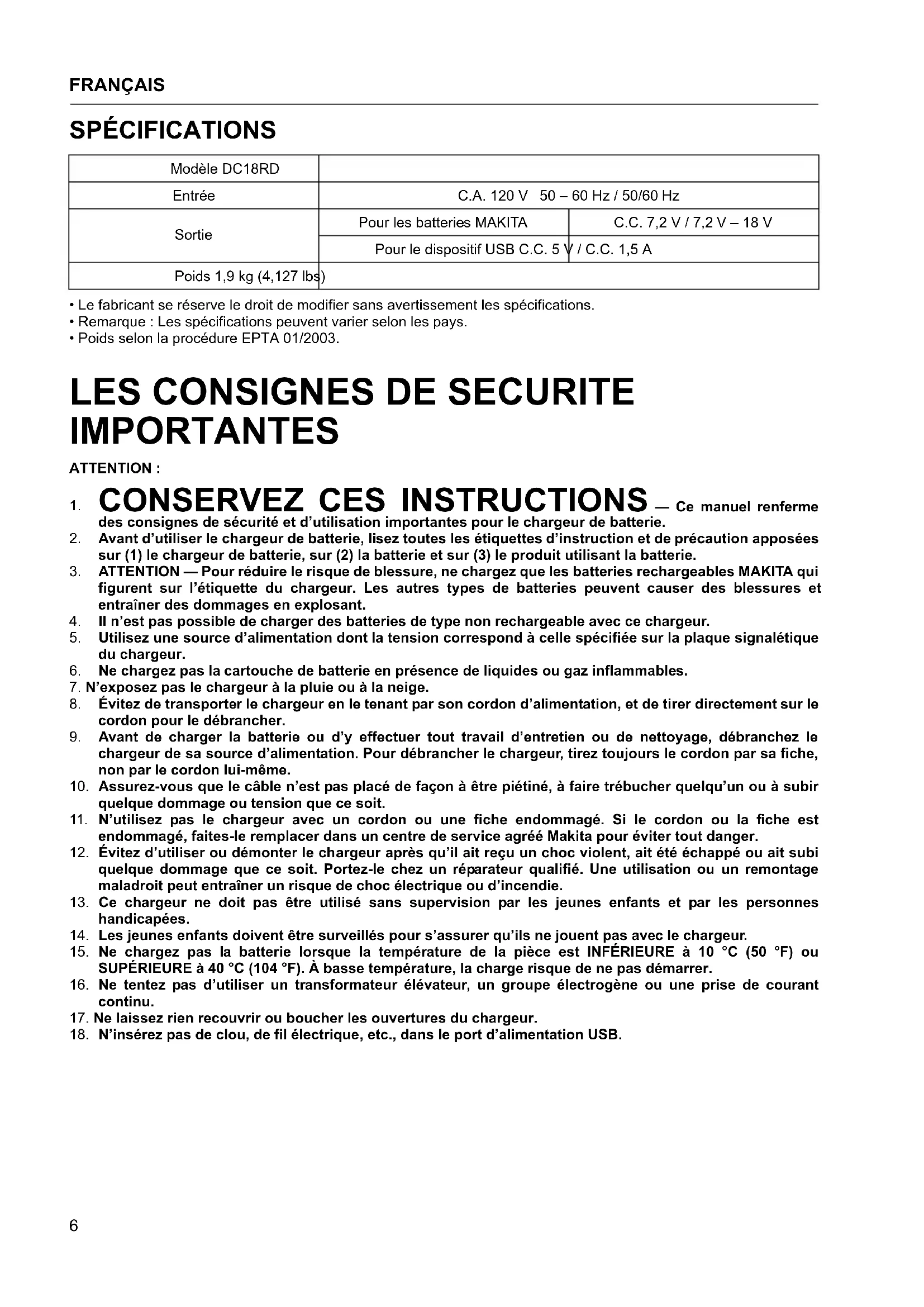 3. ATTENTION — Pour réduire le risque de blessure, ne chargez que les batteries rechargeables MAKITA qui