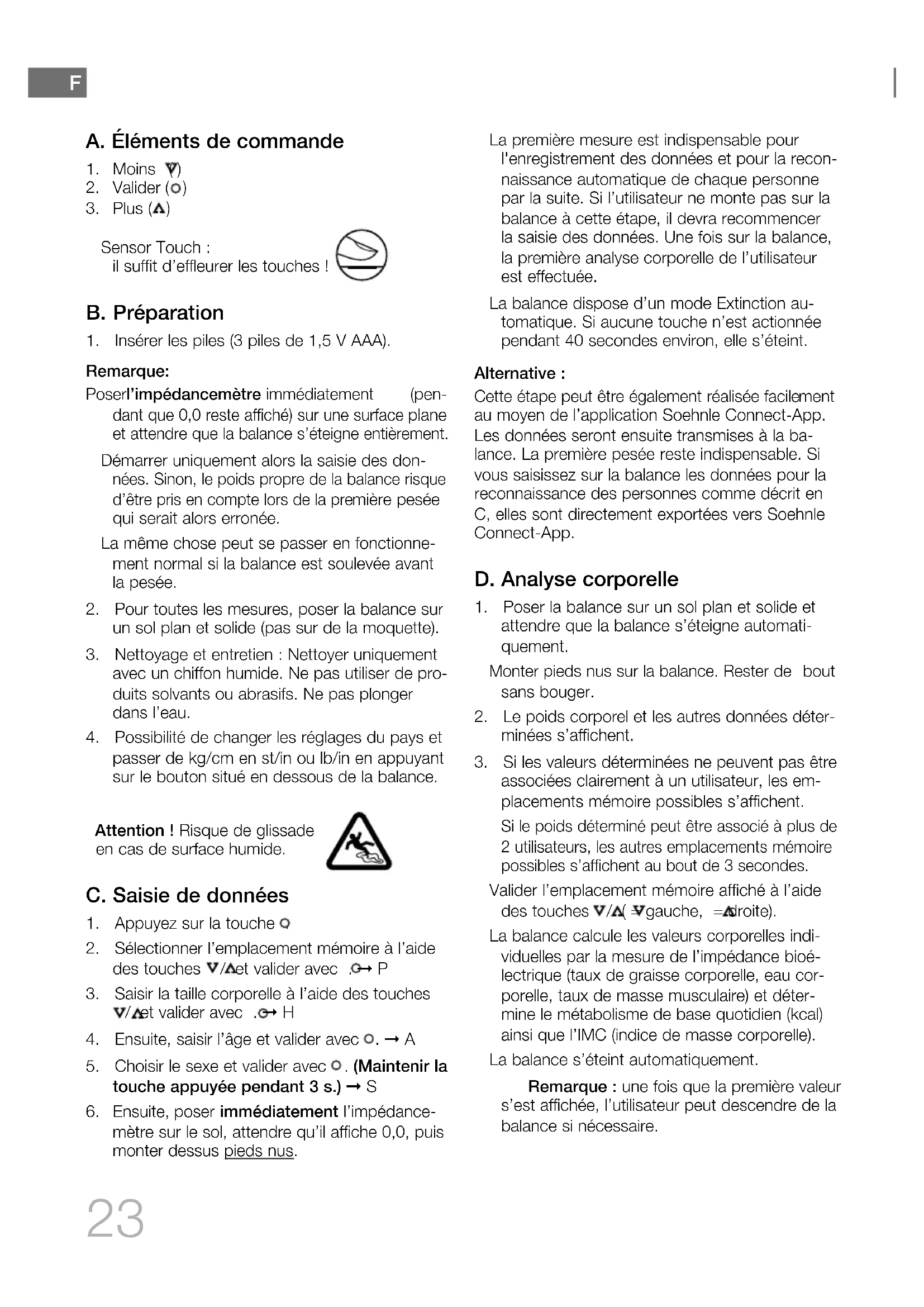 mètre sur le sol, attendre qu’il affiche 0,0, puis monter dessus pieds nus. La première mesure est indispensable pour l'enregistrement des données et pour la recon- naissance automatique de chaque personne par la suite. Si l’utilisateur ne monte pas sur la balance à cette étape, il devra recommencer la saisie des données. Une fois sur la balance, la première analyse corporelle de l’utilisateur est effectuée. La balance dispose d’un mode Extinction au- tomatique. Si aucune touche n’est actionnée pendant 40 secondes environ, elle s’éteint. Alternative : Cette étape peut être également réalisée facile ment au moyen de l’application Soehnle Connect-App. Les données seront ensuite transmises à la ba- lance. La première pesée reste indispensable. Si vous saisissez sur la balance les données pour la reconnaissance des personnes comme décrit en C, elles sont directement exportées vers Soehnle Connect-App. D. Analyse corporelle