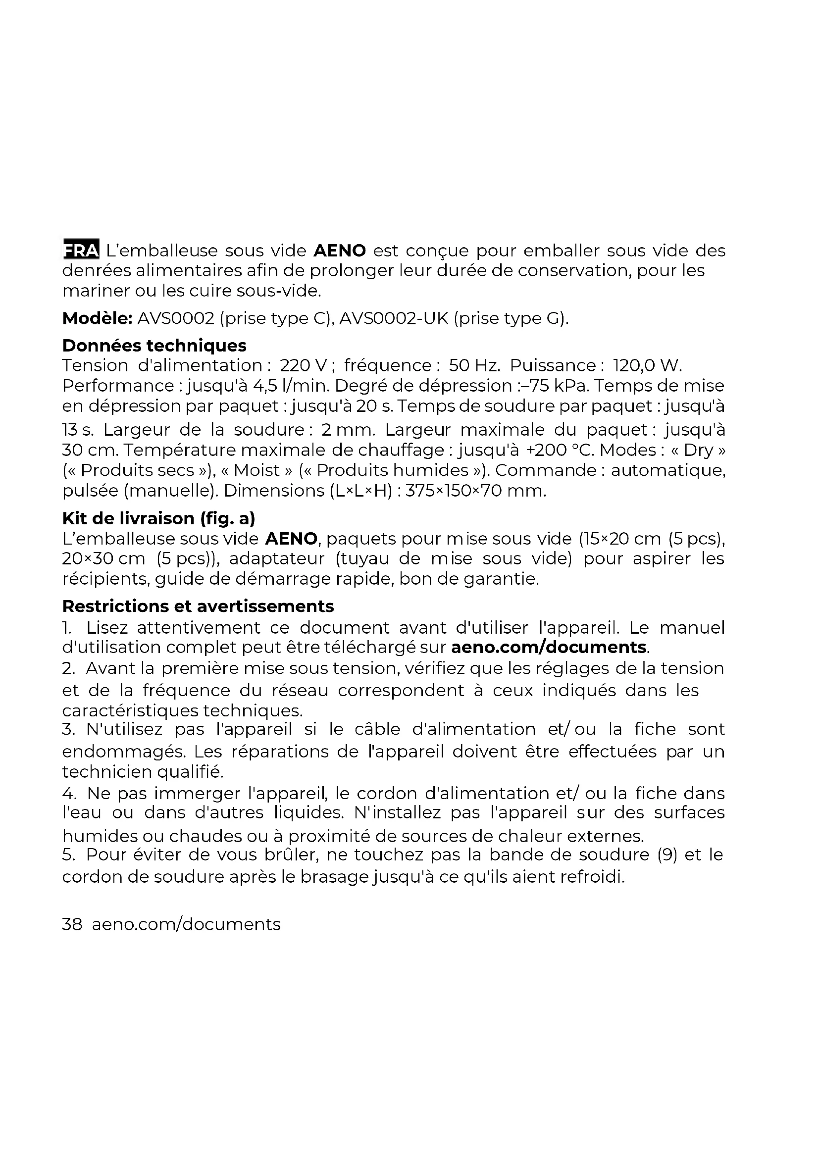 Ces symboles indiquent que vous devez respecter la réglementation relative aux déchets d'équipements électriques et électroniques (WEEE) et aux piles et accumulateurs usagés lorsque vous mettez au rebut l'appareil, ses piles et accumulateurs et ses accessoires électriques et électroniques. Conformément à la réglementation, cet équipement doit être éliminé séparément à la fin de sa vie utile. N’utilisez pas l'appareil, ses piles et accumulateurs ou ses accessoires électriques et électroniques avec les déchets municipaux non triés, car cela serait nuisible à l'environnement. Pour mettre au rebut cet équipement, il faut le retourner au point de vente ou le remettre à un centre de recyclage local. Vous devez contacter votre service local d'élimination des déchets ménagers pour plus de détails. ASBISc se réserve le droit de modifier l'appareil et d'apporter des changements et des altérations à ce document sans préavis aux utilisateurs. La période de garantie et la durée de vie du produit sont de 2 ans à compter de la date d'achat du produit. Détails du fabricant : ASBISc Enterprises PLC, Iapetou, 1, Agios Athanasios, 4101, Limassol, Cyprus (Chypre). Fabriqué en Chine. Des informations actualisées et des descriptions détaillées des appareils, ainsi que des instructions de connexion, des certificats, des informations sur les réclamations de qualité et les garanties, peuvent être téléchargées sur aeno.com/documents. Toutes les marques et tous les noms de marque mentionnés sont la propriété de leurs détenteurs respectifs.aeno.com/documents 43 HRV Vakuumski aparat za brtvljenje AENO namijenjen je vakuumskom pakiranju prehrambenih proizvoda kako bi se produljio njihov rok trajanja, mariniranje ili sous-vide kuhanje. Model: AVS0002 (prise type C), AVS0002-UK (prise type G). Specifikacije Napon: 220 V; frekvencija: 50 Hz. Snaga: 120.0 W. Produktivnost: do 4,5 l/min. Stupanj vakumiranja:–75 kPa. Vrijeme vakumiranja jedne kesice: do 20 sek. Vrijeme brtvljenja jedne kesice: do 13 sek. Širina šava: 2 mm. Maksimalna širina kese: do 30 cm. Maksimalna temperatura grijanja: do + 200 °C. Načini rada: "Dry" ("Suho"), "Moist" ("Vlažno"). Upravljanje: automatsko, impulsno (ručno). Dimenzije (D׊×V): 375×150×70 mm. Sadržaj isporuke (slika a) Vakumski aparat AENO, vakuumske kese (15×20 cm (5 kom.), 20×30 cm (5 kom.)), adapter (vakum crijevo) zavakumiranje posuea, kratki korisnilki vodič, jamstveni list. Ograničenja i upozorenja
