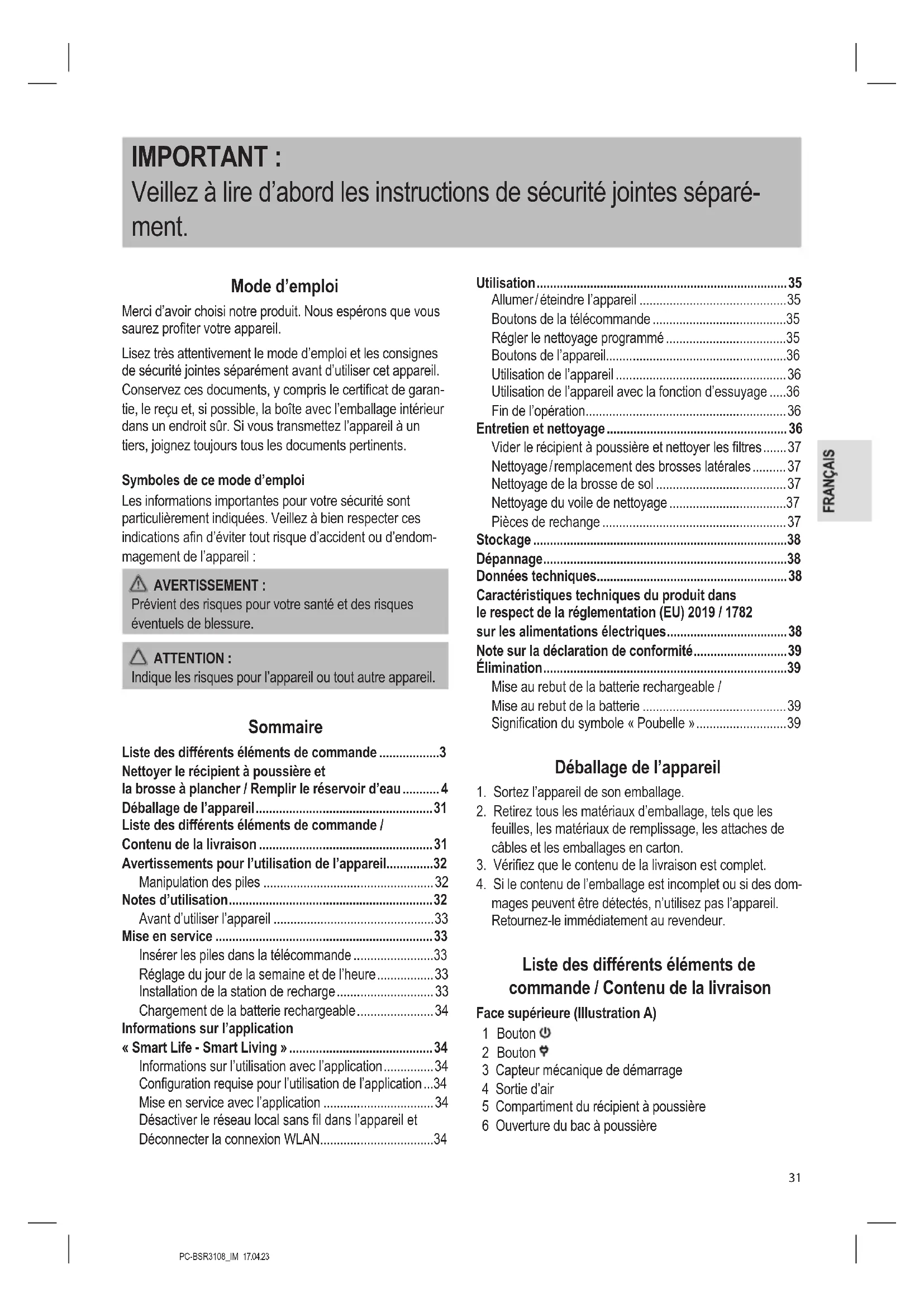 mages peuvent être détectés, n’utilisez pas l’appareil. Retournez-le immédiatement au revendeur. Liste des différents éléments de commande / Contenu de la livraison Face supérieure (Illustration A) 1 Bouton 2 Bouton 3 Capteur mécanique de démarrage 4 Sortie d’air 5 Compartiment du récipient à poussière 6 Ouverture du bac à poussièrePC-BSR3108_IM 17.04.23