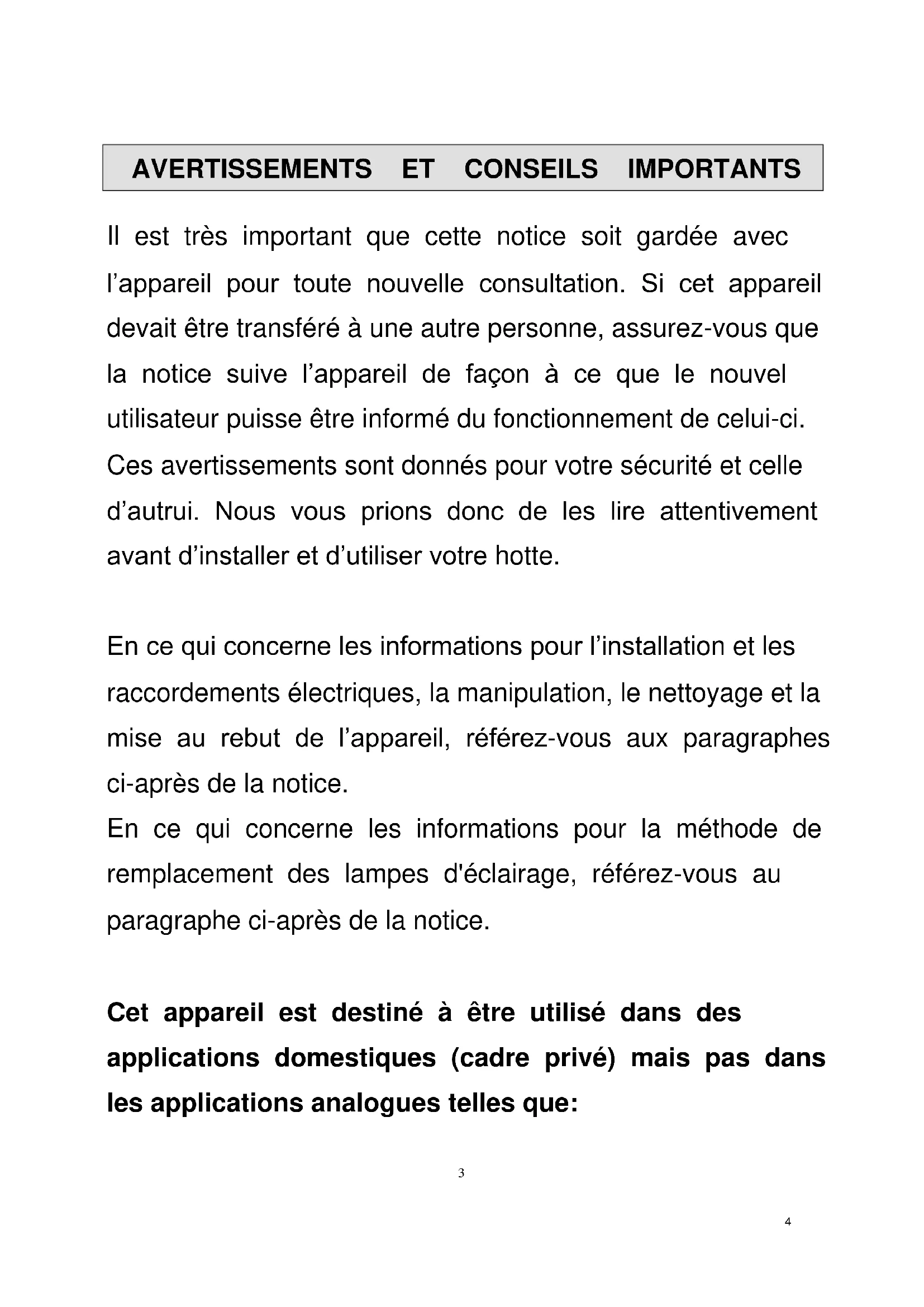 Il est très important que cette notice soit gardée avec l’appareil pour toute nouvelle consultation. Si cet appareil devait être transféré à une autre personne, assurez-vous que la notice suive l’appareil de façon à ce que le nouvel utilisateur puisse être informé du fonctionnement de celui-ci. Ces avertissements sont donnés pour votre sécurité et celle d’autrui. Nous vous prions donc de les lire attentivement avant d’installer et d’utiliser votre hotte. En ce qui concerne les informations pour l’installation et les raccordements électriques, la manipulation, le nettoyage et la mise au rebut de l’appareil, référez-vous aux paragraphes ci-après de la notice. En ce qui concerne les informations pour la méthode de remplacement des lampes d'éclairage, référez-vous au paragraphe ci-après de la notice. Cet appareil est destiné à être utilisé dans des applications domestiques (cadre privé) mais pas dans les applications analogues telles que: