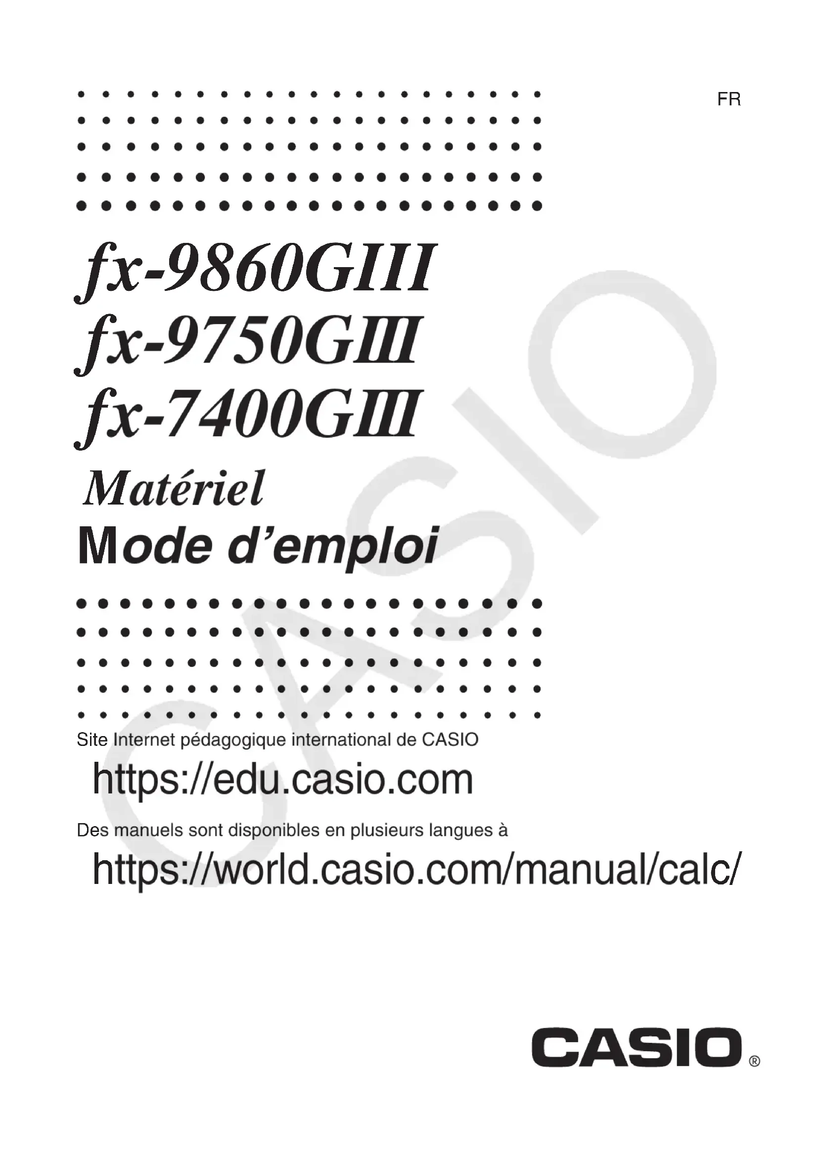 fx-9860GIII fx-9750GIII fx-7400GIII Matériel Mode d’emploi Site Internet pédagogique international de CASIO https://edu.casio.com Des manuels sont disponibles en plusieurs langues à https://world.casio.com/manual/calc/ FRLes noms de sociétés et de produits dans ce manuel peuvent être des marques déposées ou des marques commerciales de leurs détenteurs respectifs.i