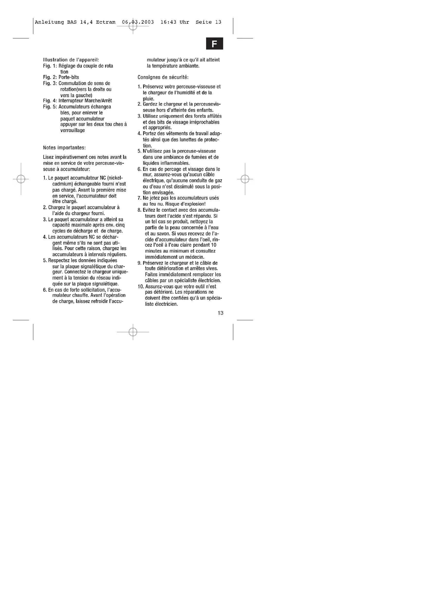 Anleitung BAS 14,4 Ectram 06.03.2003 16:43 Uhr Seite 1213 Illustration de l’appareil: Fig. 1: Réglage du couple de rota tion Fig. 2: Porte-bits Fig. 3: Commutation de sens de rotation(vers la droite ou vers la gauche) Fig. 4: Interrupteur Marche/Arrêt Fig. 5: Accumulateurs échangea bles, pour enlever le paquet accumulateur appuyer sur les deux tou ches à verrouillage Notes importantes: Lisez impérativement ces notes avant la mise en service de votre perceuse-vis- seuse à accumulateur: