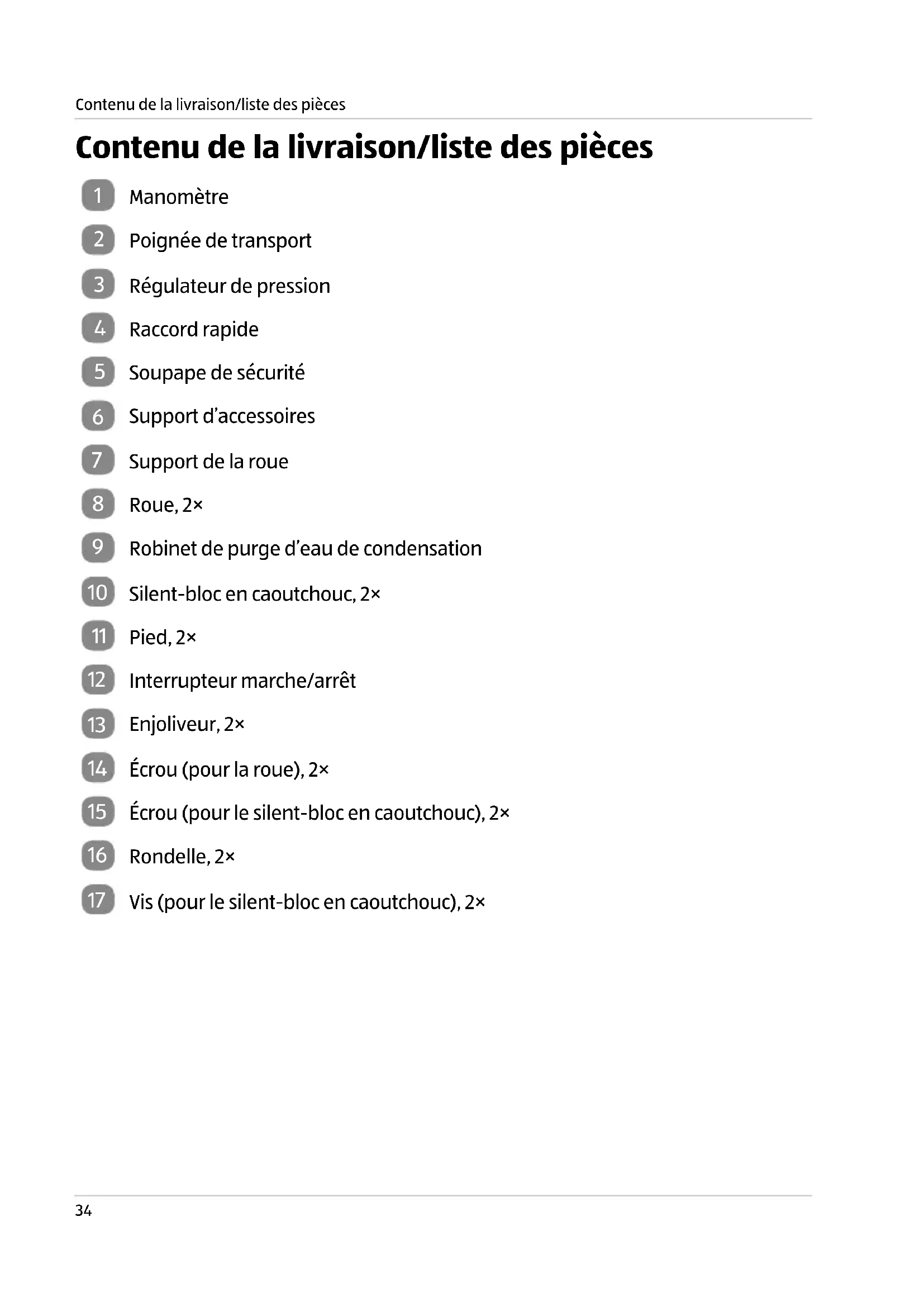 Contenu de la livraison/liste des pièces