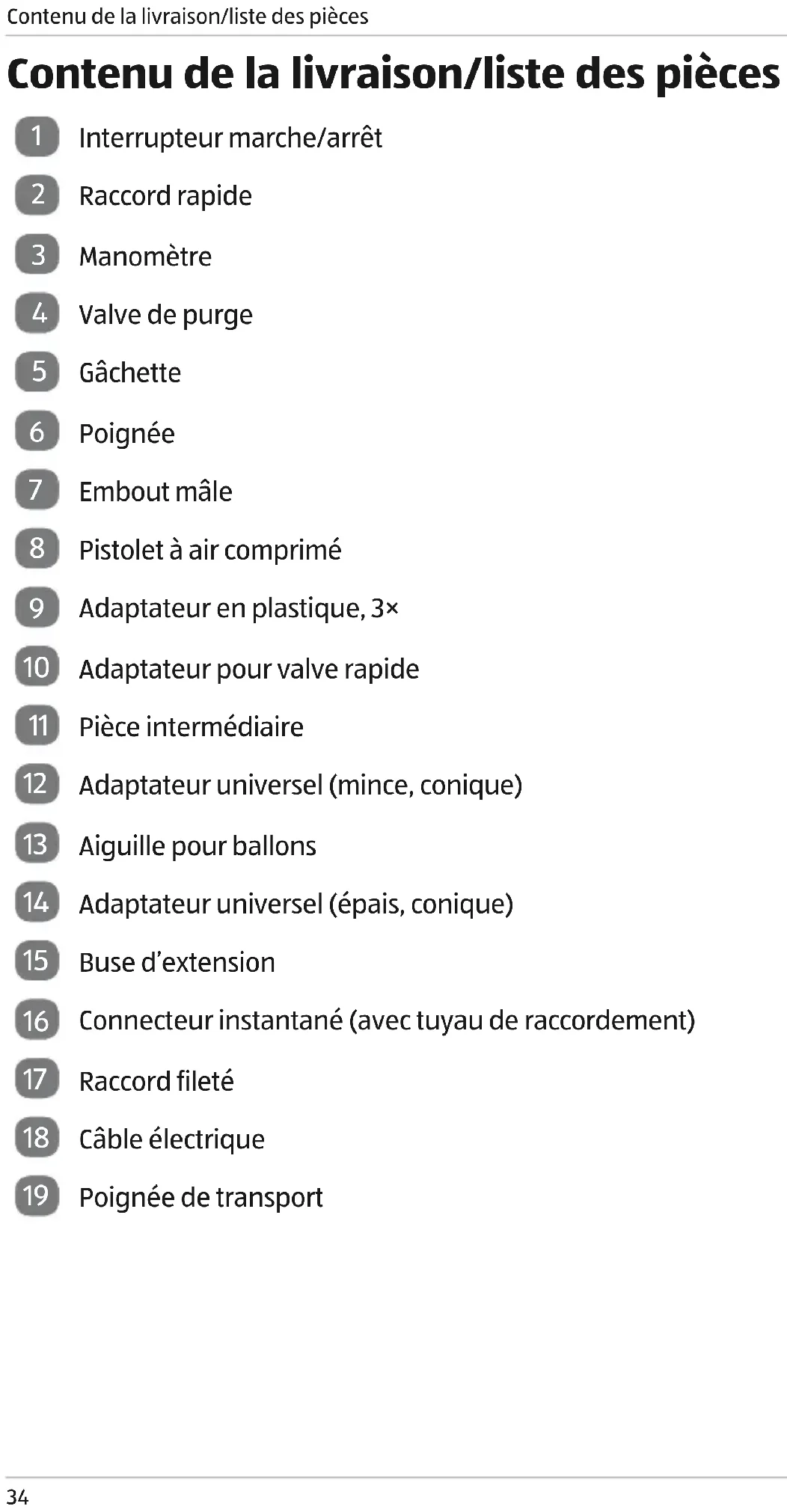 Vérifier le compresseur et le contenu de la livraison AVERTISSEMENT! Risque d’ingestion et d’étouffement! Les enfants ne doivent pas jouer avec les sachets en plastique, les films ou les petites pièces. Il y a risque d’ingestion et de suffocation. − Tenez les enfants à l’écart du compresseur, des petites pièces et du matériel d’emballage. − Le compresseur n’est pas un jouet pour enfants.