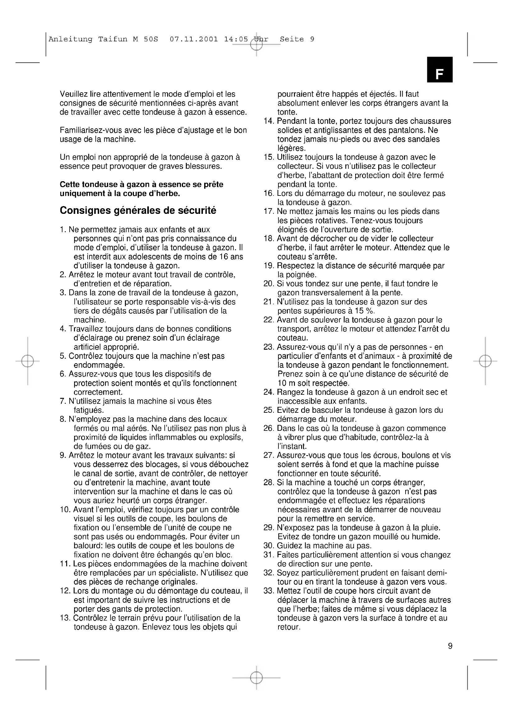 déplacer la machine à travers de surfaces autres que l’herbe; faites de même si vous déplacez la tondeuse à gazon vers la surface à tondre et au retour. Anleitung Taifun M 50S 07.11.2001 14:05 Uhr Seite 910